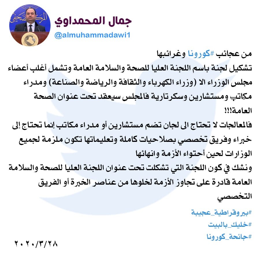 وقال المحمداوي في تغريدة، أن “المعالجات تحتاج إلى خبراء وفريق تخصصي بصلاحيات كاملة وتعليمات تكون ملزمة لجميع الوزارات لحين أحتواء الأزمة وأنهائها، وليس خلية تضم مستشارين ومدراء مكاتب وسكرتارية”.