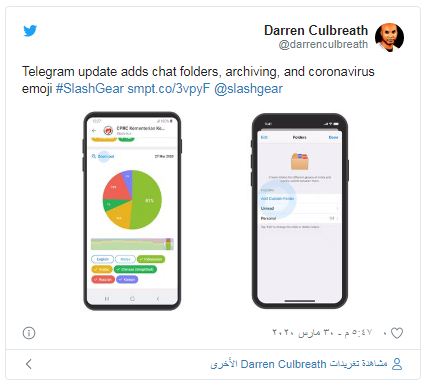 كما أضافت أيضا تلغرام في تحديثها الجديد رموز تعبيرية جديدة “إيموجي” خاصة بفيروس كورونا، والتي تحث الأصدقاء للبقاء في المنزل أو البقاء في أمان.
