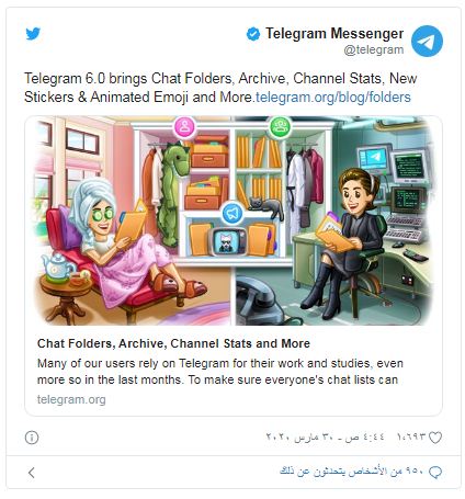 وقالت تلغرام إن تقنية مجلدات الدردشة ستكون مثالية للتعامل مع الحمل المتزايد من الرسائل، سواء المرتبطة بالعمل أو الدردشات الشخصية.