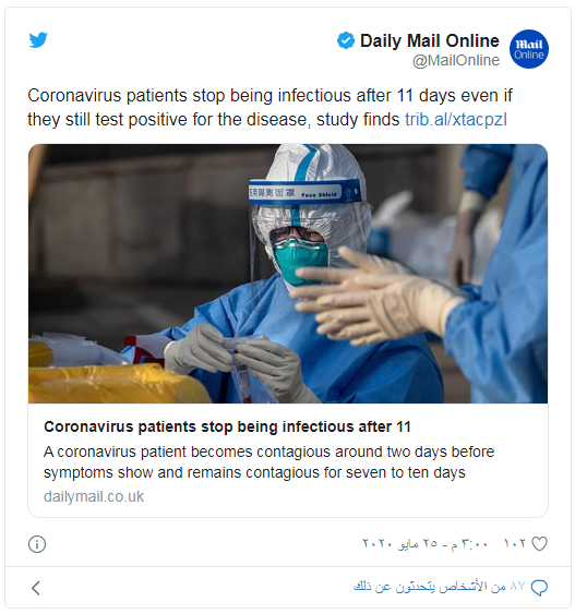 وأضافوا: “ينخفض التكاثر الفيروسي النشط بسرعة بعد الأسبوع الأول، ولم يتم العثور على فيروس قابل للحياة بعد الأسبوع الثاني من المرض”.
