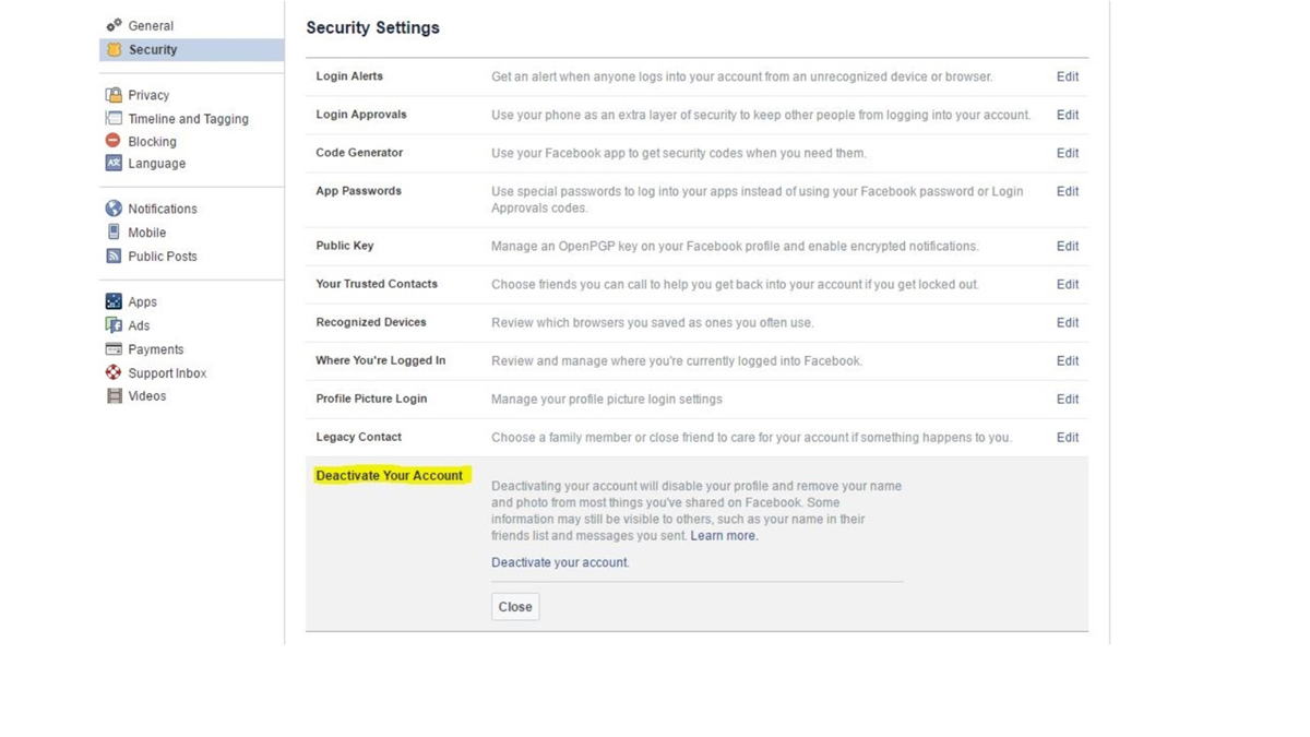 النقر على رأس السهم المتجه للأسفل في أعلى يمين صفحة فيسبوك، واختيار “إعدادات”، ثم النقر على “الأمن” من القائمة التي تظهر على يسار الشاشة، ومن خيارات “الأمن” التي ستظهر على اليمين تختار “تعطيل حسابك” ثم تتبع الخطوات لتأكيد العملية.