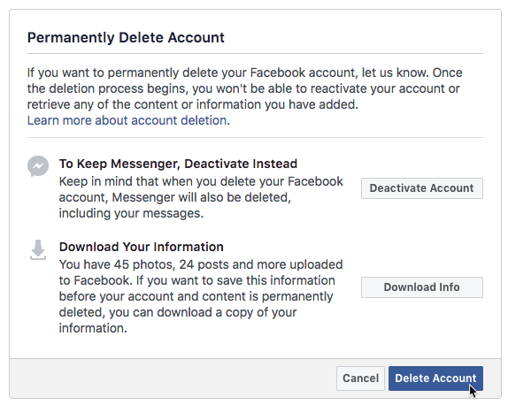 قد يستغرق الأمر من فيسبوك حتى تسعين يوما كي يحذف كافة ما نشرته على حسابك، مثل الصور وتحديثات الحالة أو أي بيانات حُفظت في أنظمة الحفظ الاحتياطي، وأثناء تلك المدة التي يتولى فيها فيسبوك حذف معلوماتك، فإنها لن تكون متاحة لأي شخص آخر يستخدم الشبكة الاجتماعية.