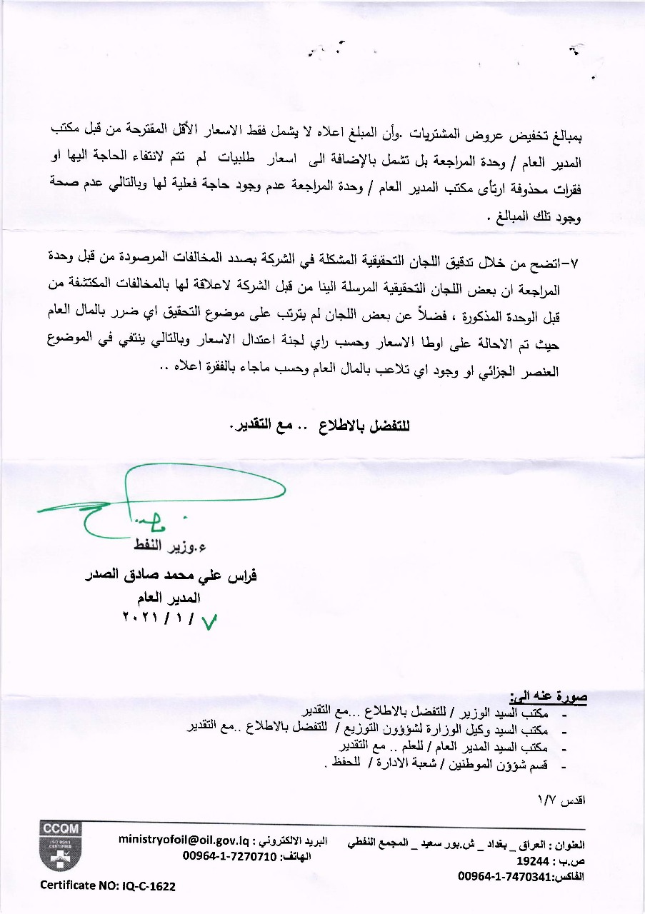 إجابت الوزارة على السؤال البرلماني بحسب الوثيقة الصادرة منها والتي جاء فيها ” بعد إنجاز التحقيق الإداري الخاص بالموضوع تم الغاء وحدة المراجعة لعدم قانونية استحداثها من حيث المهام وتوحيه الإدارة العليا في الشركة بالالتزام بالتعليمات والضوابط”.