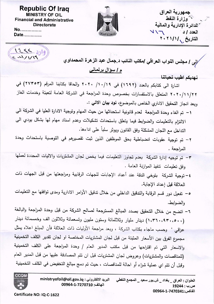 بعد ان وجه النائب جمال المحمداوي سؤالا برلمانيا إلى وزير النفط في (١٩ / ١٠ / ٢٠٢٠) بشأن التلاعب المالي في أسعار المشتريات في شركة تعبئة الغاز وحدة المراجعة.