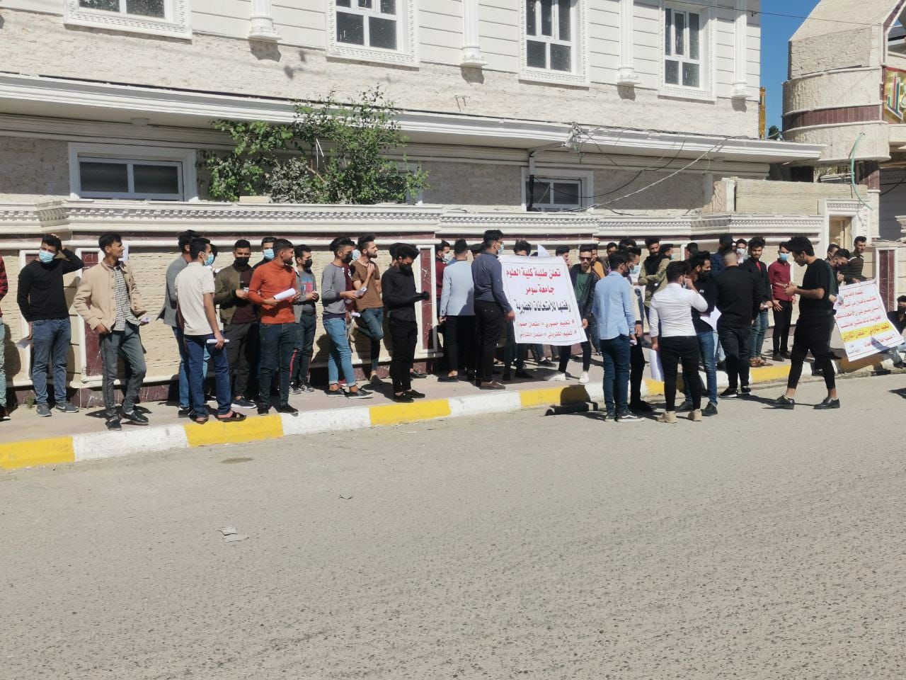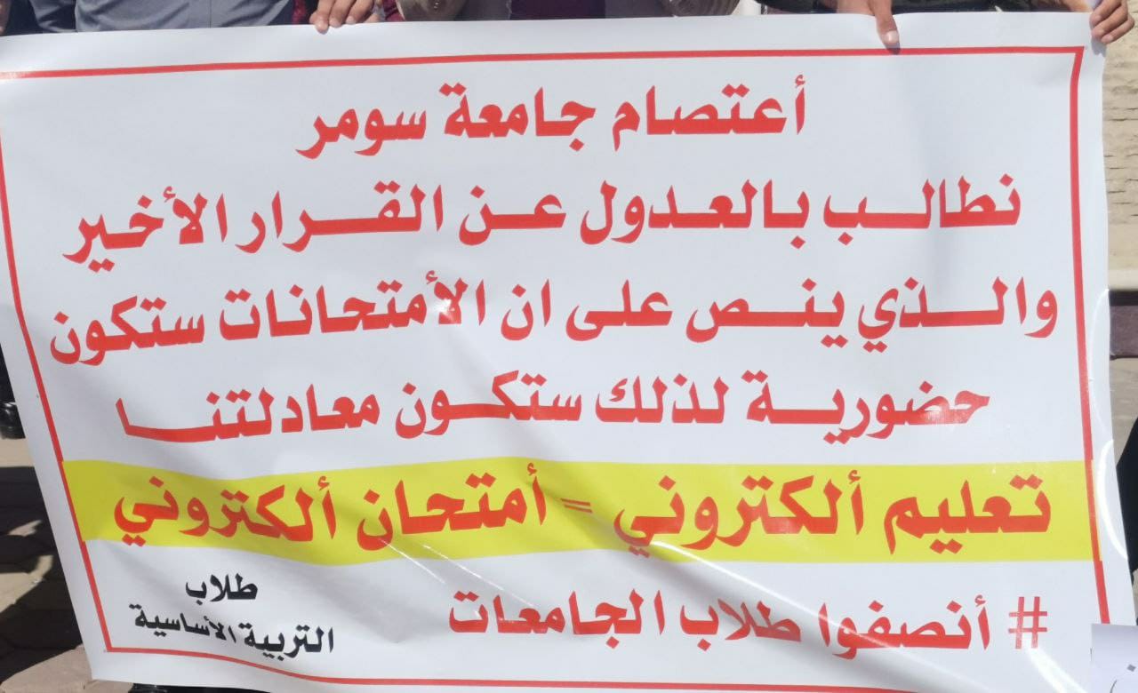وذكر مراسل جريدة الناصرية الالكترونية أن العشرات من طلبة كلية التربية في جامعة سومر نظموا اعتصاما في قضاء الرفاعي شمال ذي قار للمطالبة بالامتحان الإلكتروني.