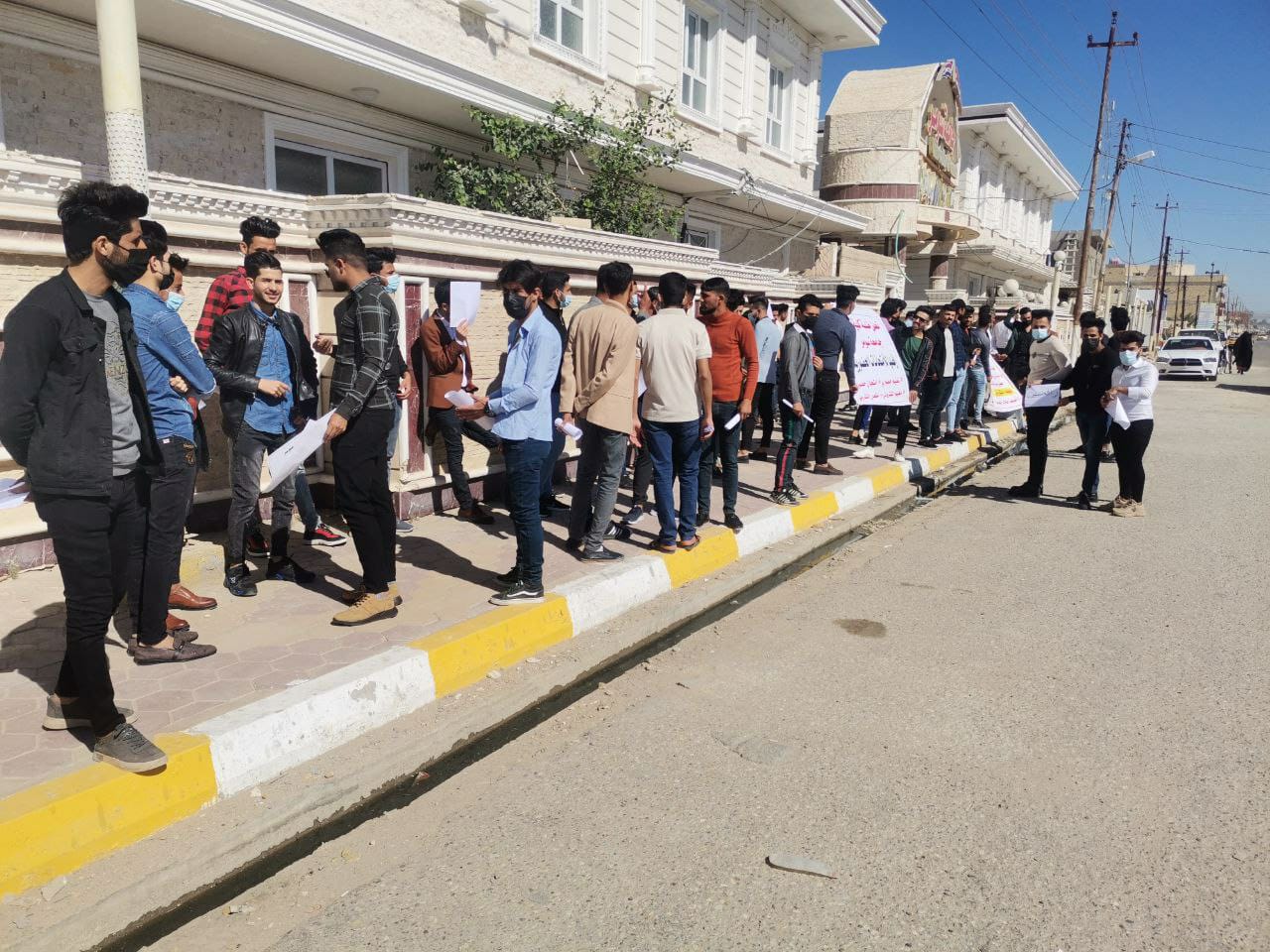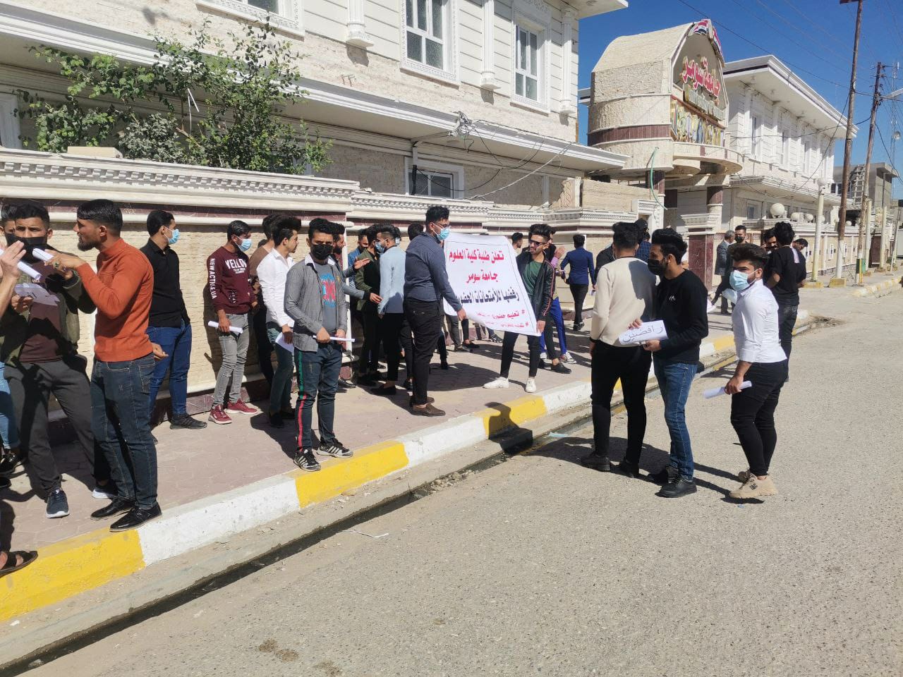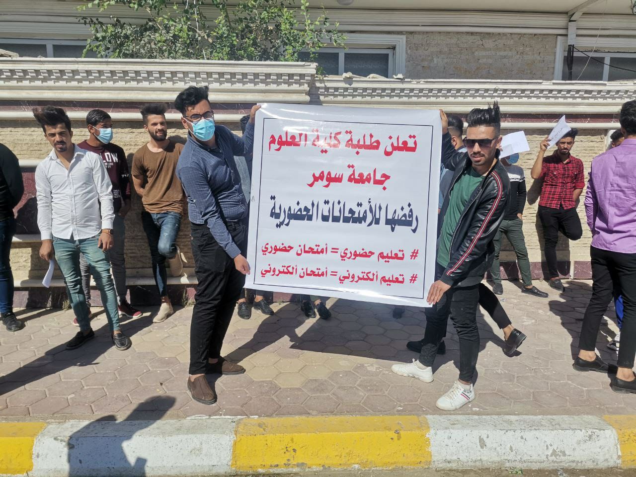 واضاف المراسل؛ أن المعتصمين طالبوا بعدم تطبيق قرار الامتحان الحضوري، فيما رفعوا شعار ( تعليم إلكتروني – امتحان إلكتروني).