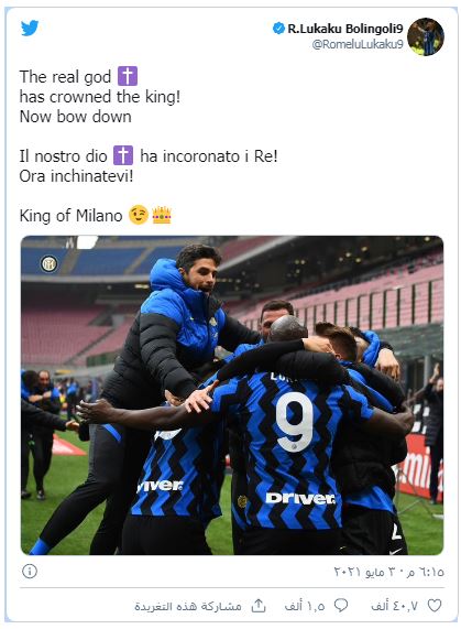 وبعد تتويج إنتر ميلان بلقب الدوري الإيطالي لكرة القدم، نشر لوكاكو رسالة عبر حسابه على “تويتر” قال فيها: “الإله الحقيقي قد توج ملكاً لميلانو، الآن انحنوا”.