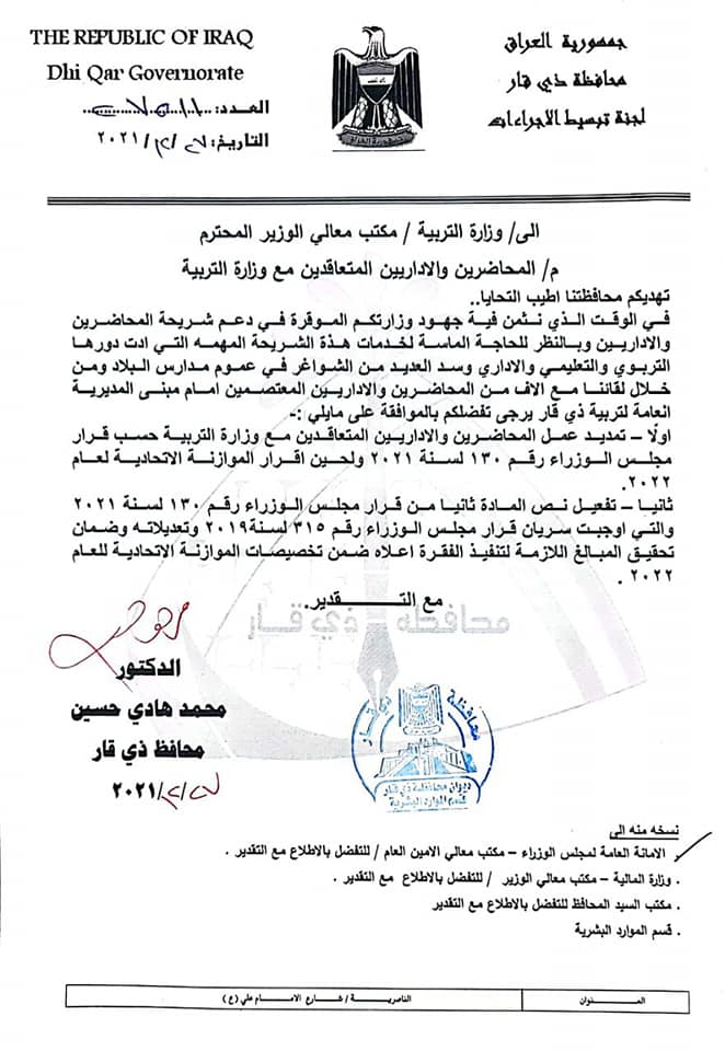 أخبار الناصرية بالوثيقة ..ذي قار تخاطب وزارتي التربية والمالية لتمديد عمل المحاضرين في 28/12/2021 جريدة الناصرية الالكترونية: بالوثيقة ذي قار تخاطب وزارتي التربية والمالية لتمديد عمل المحاضرين. شارك هذا الموضوع: النقر للمشاركة على X (فتح في نافذة جديدة) X انقر للمشاركة على فيسبوك (فتح في نافذة جديدة) فيس بوك مرتبط أكمل القراءة