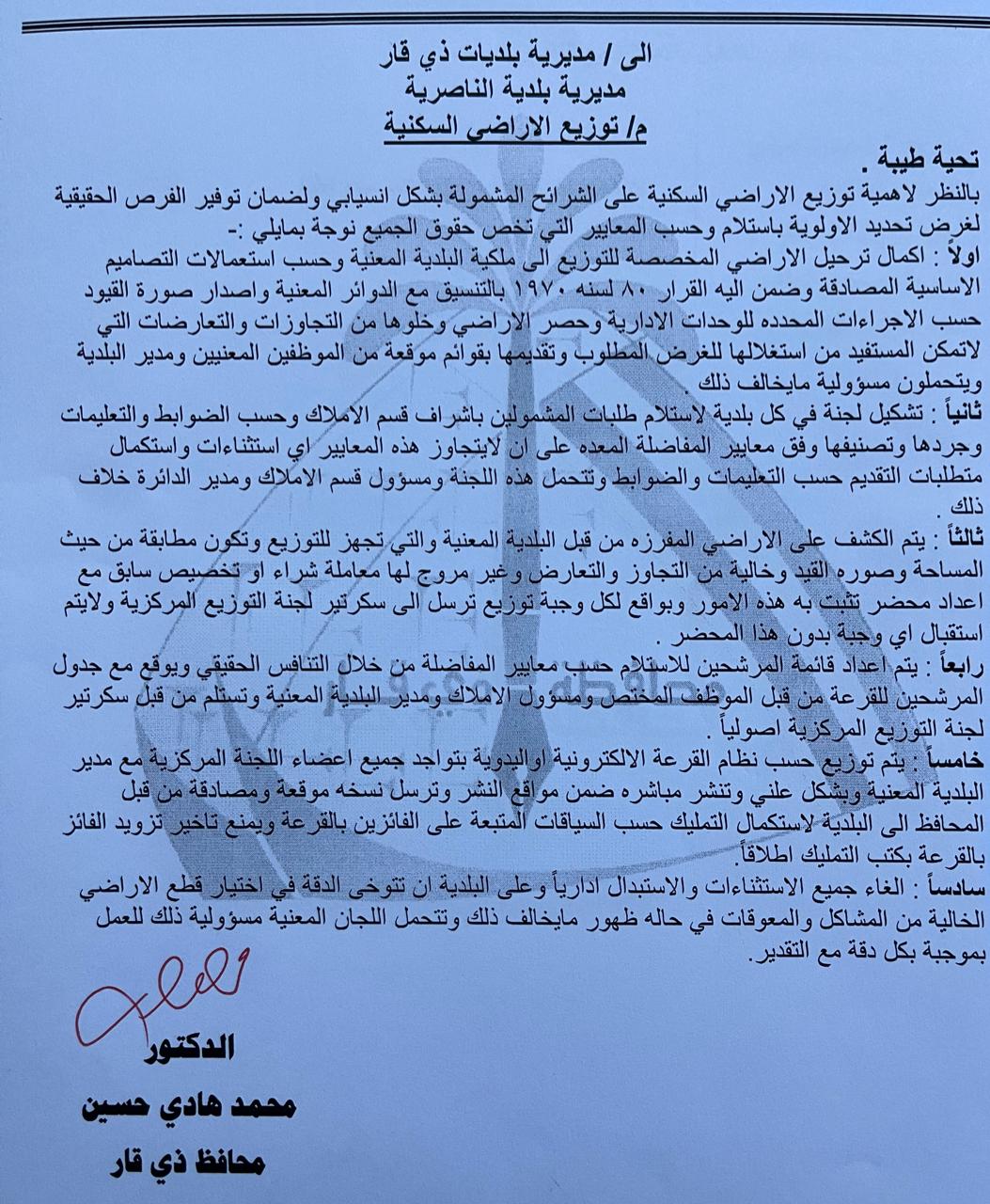 ووجه الغزي بحسب وثيقة صادرة عن مكتبه، بلدية الناصرية ، بإعتماد معايير المفاضلة بين المشمولين ، وإحتساب النقاط في آلية التوزيع كأساس للاستحقاق ،مؤكداً على اهمية عامل الدقة والشفافية في المفاضلة .