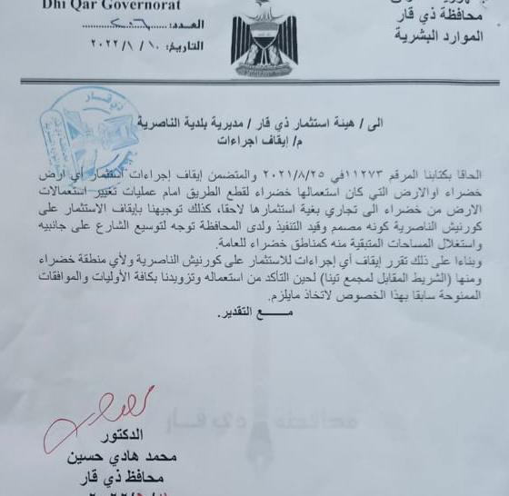 بالوثيقة…ذي قار توقف ترويج المعاملات الإستثمارية على كورنيش الناصرية والساحات الخضراء