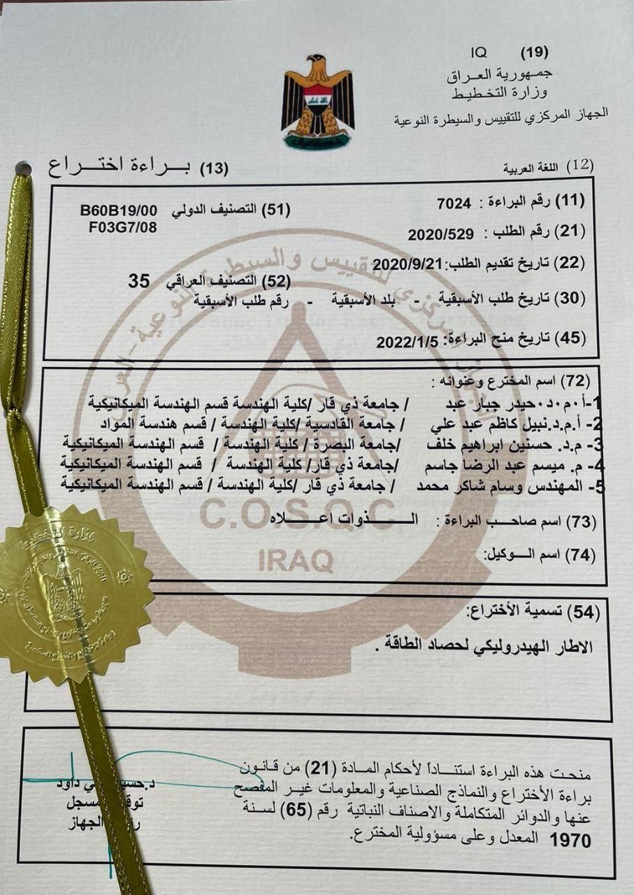 وقالت الجامعة في بيان إن “فريق بحثي مشترك من كلية الهندسة قسم الهندسة الميكانيكية في جامعة ذي قار ضم كل من الاستاذ المساعد الدكتور حيدر جبار عبد و المدرس ميسم عبدالرضا جاسم والمهندس وسام شاكر محمد وا.م.د نبيل كاظم عبدعلي من جامعة القاسية و م.د حسنين ابراهيم خلف من جامعة البصرة حصلوا على براءة اختراع مشتركة عن موضوع (الاطار الهيدروليكي لحصاد الطاقة) (HYDRAULIC TIRE FOR ENERGY HARVESTING )”.
