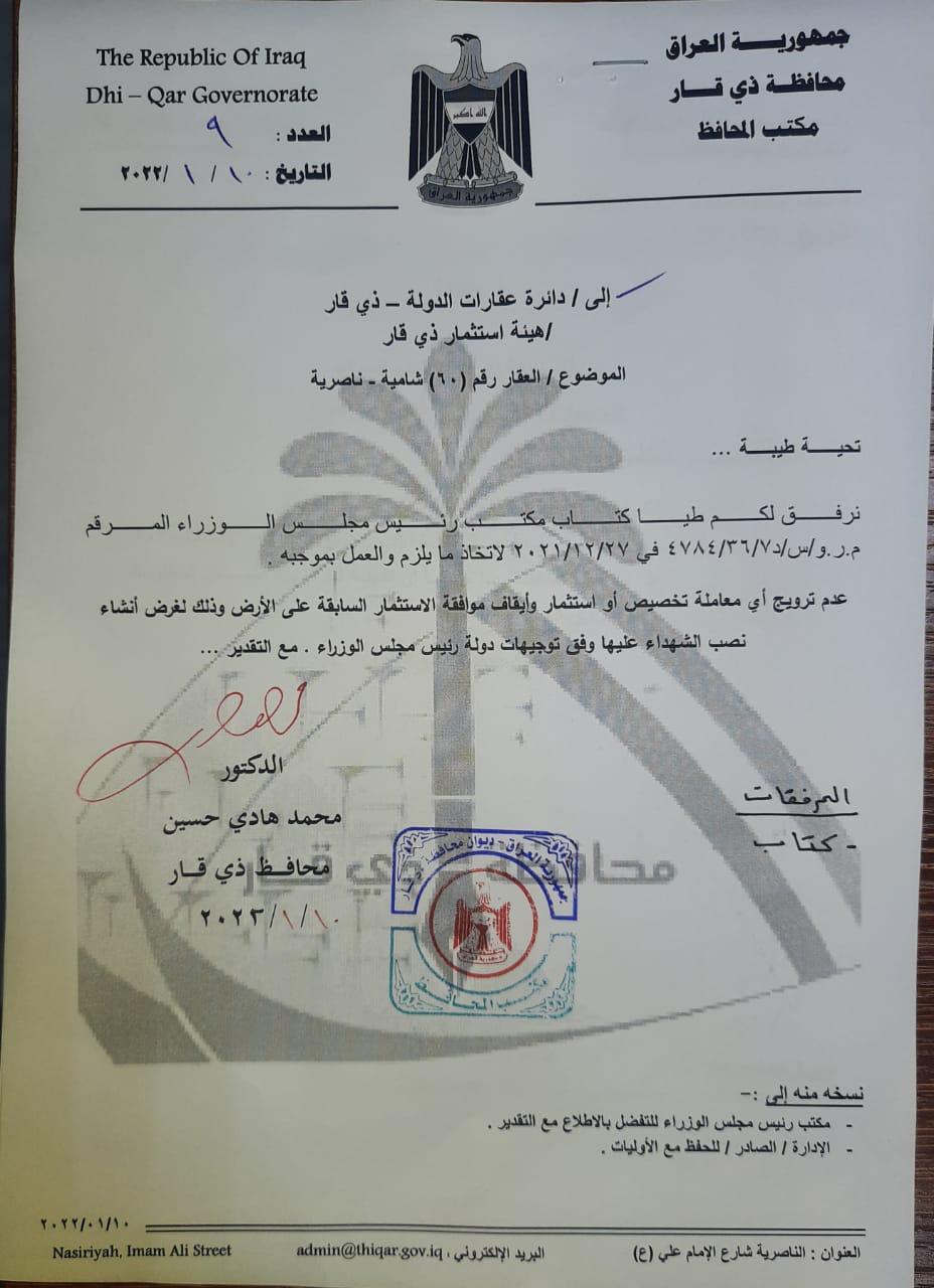 بالوثيقة…توجيه عقارات الدولة بإلغاء تخصيص فوج المهمات في الناصرية للاستثمار لغرض انشاء نصب الشهداء