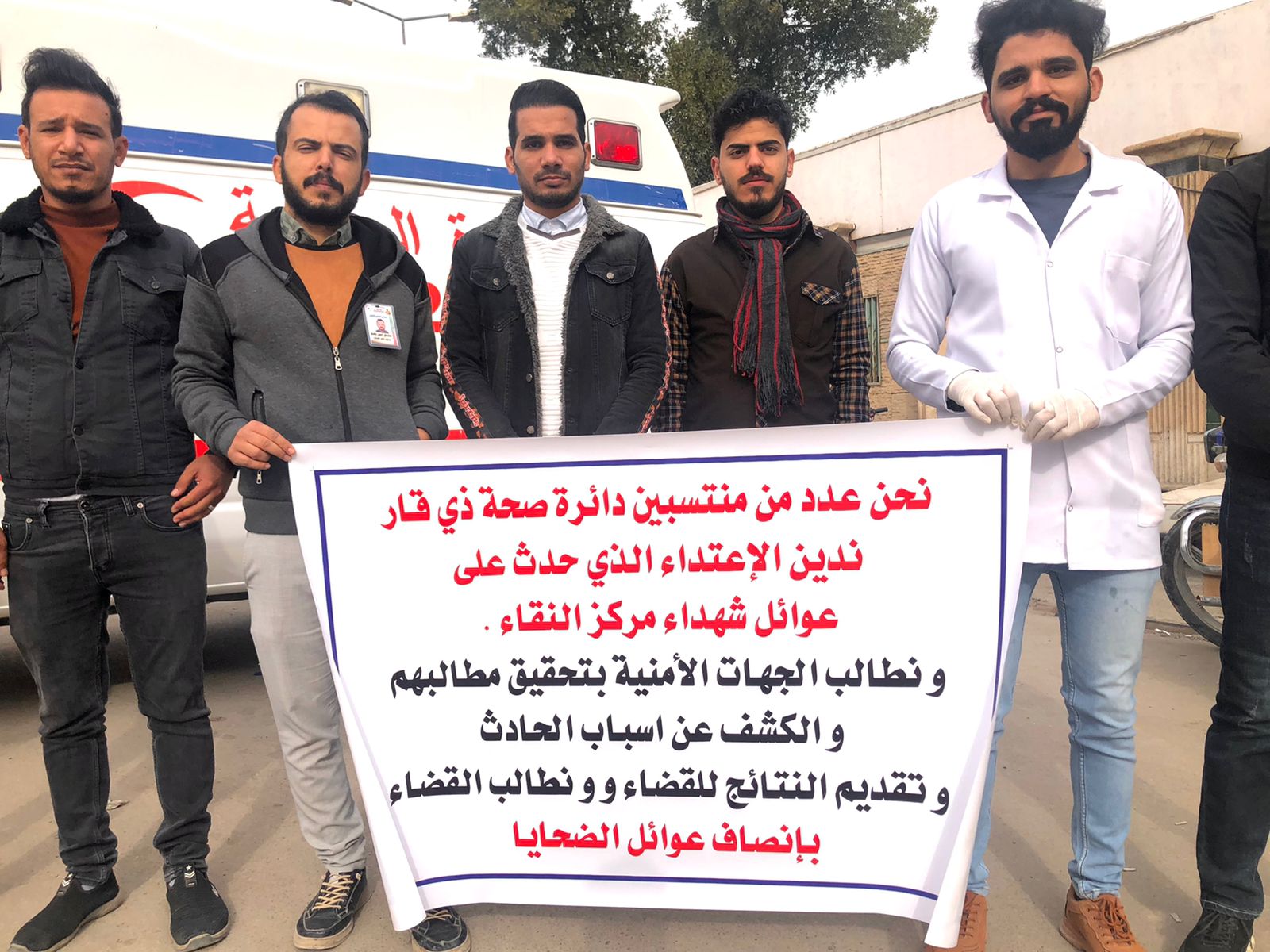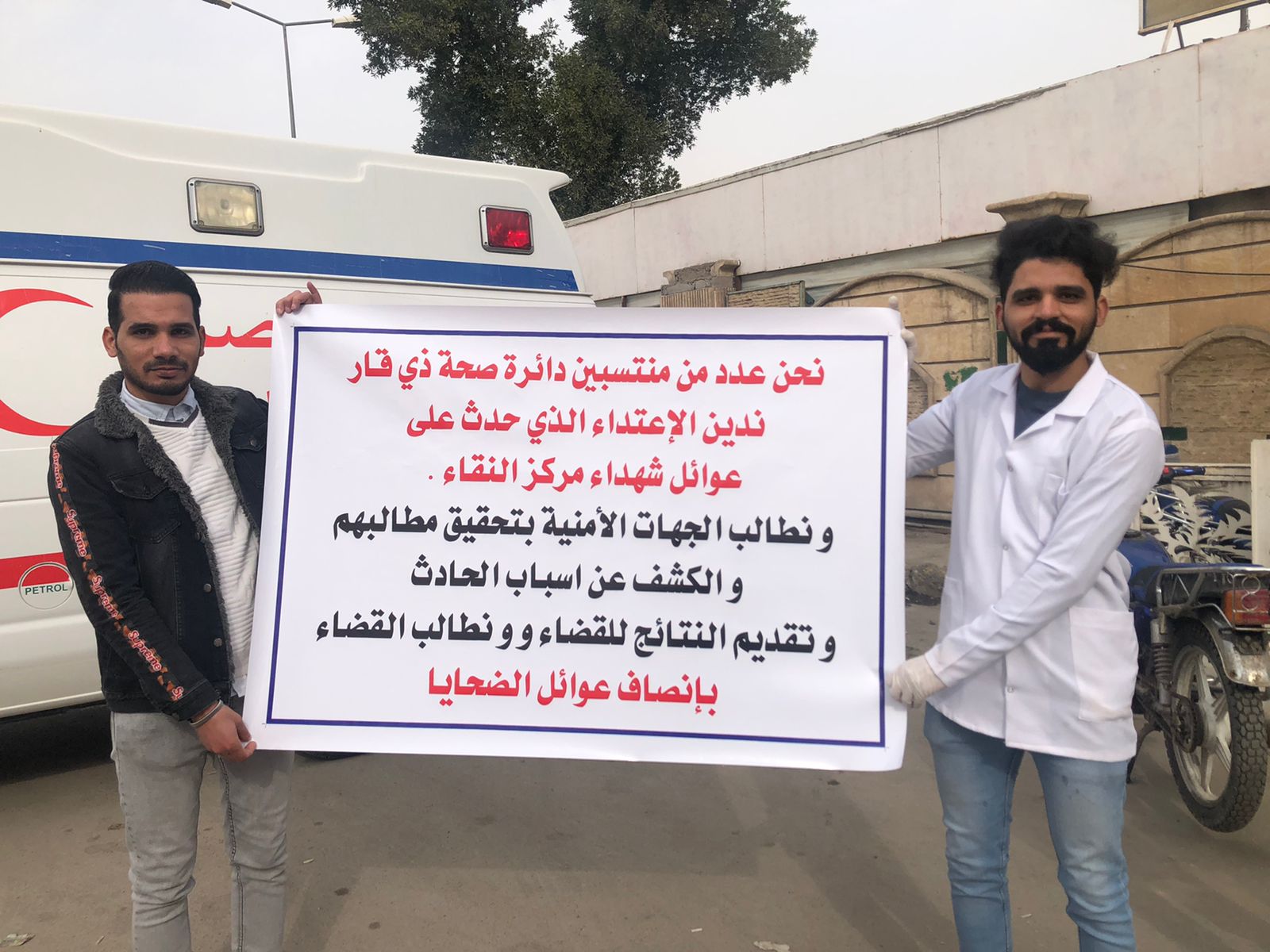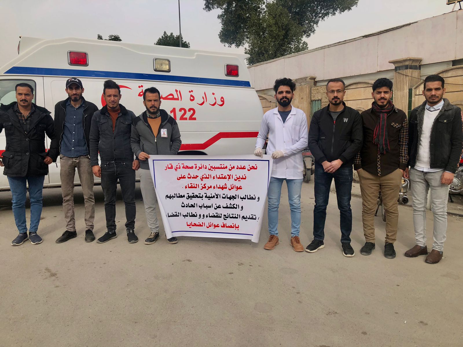 نظم العشرات من الموظفين العاملين في دائرة صحة ذي قار اليوم الاثنين وقفة استنكارا احتجاجا على الاعتداء الذي حصل على ذوي ضحايا مركز النقاء الذين تظاهروا يوم أمس الاحد أمام مستشفى الحسين التعليمي مطالبين بكشف ملابسات الحادث.