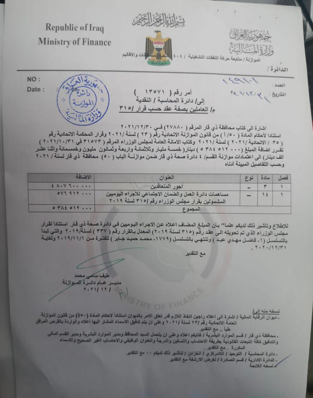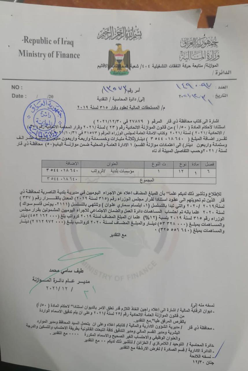 المالية توافق على صرف مستحقات عقود مديريات البلديات ، وبلدية الناصرية ، والماء ، والمجاري ، وصحة ذي قار وفق قرار ٣١٥ باثر رجعي لعامي ٢٠١٩ و ٢٠٢٠ .