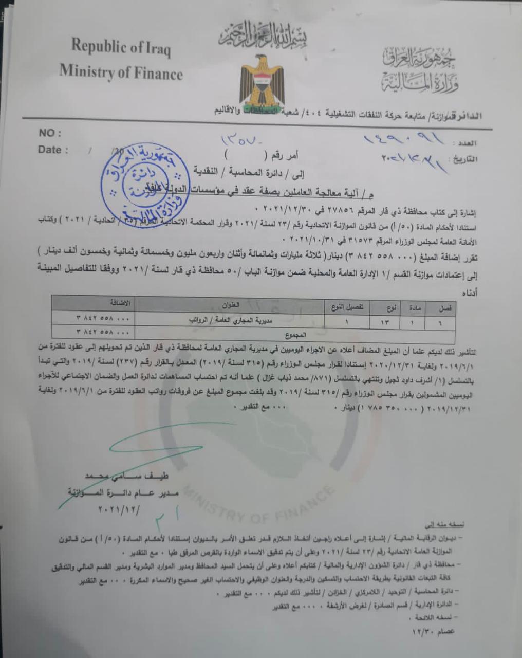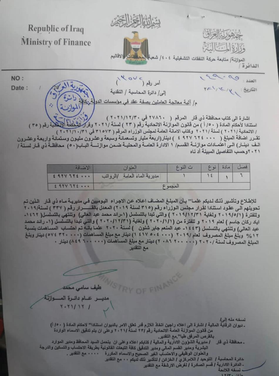بالوثائق…المالية توافق على صرف مستحقات العقود لعامين في خمس مديريات في ذي قار