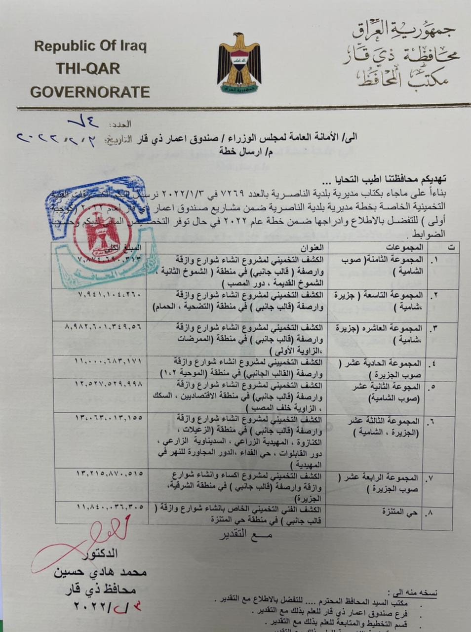 اعلن محافظ ذي قار محمد هادي الغزي اليوم الاثنين عن ارسال الوجبة الاولى من الكشوفات الفنية التخمينية الخاصة بخطة بلدية الناصرية ضمن مشاريع صندوق اعمار ذي قار، لادراجها ضمن موازنة عام 2022 في حال توفر التخصيص المالي ووفق الضوابط المعمول بها.