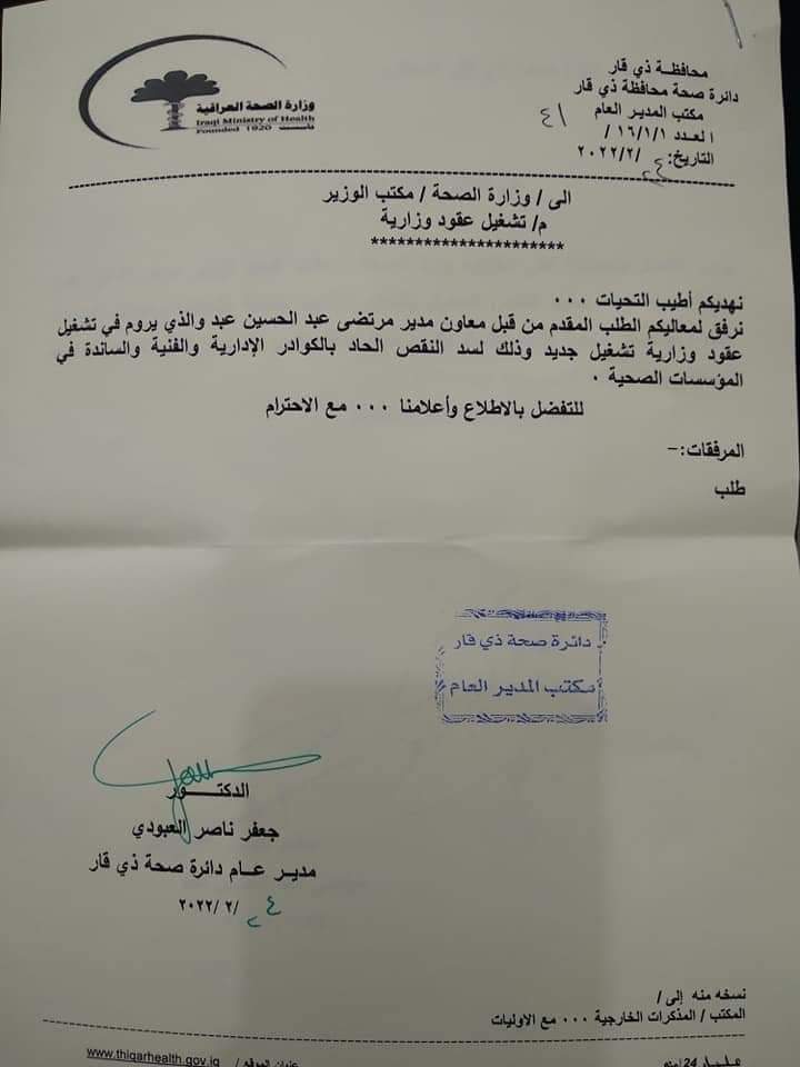 أخبار الناصرية بالوثيقة..صحة ذي قار تطالب بتشغيل عقود وزارية جديدة في 27/02/2022 جريدة الناصرية الإلكترونية: رفعت دائرة صحة ذي قار اليوم الاحد كتابا لوزارة الصحة لتشغيل عقود وزارية جديدة من الإداريين والفنيين والاختصاصات الساندة لسد النقص الحاصل في جميع المؤسسات الصحية. شارك هذا الموضوع: النقر للمشاركة على X (فتح في نافذة جديدة) X انقر للمشاركة على فيسبوك (فتح في نافذة جديدة) فيس بوك مرتبط أكمل القراءة