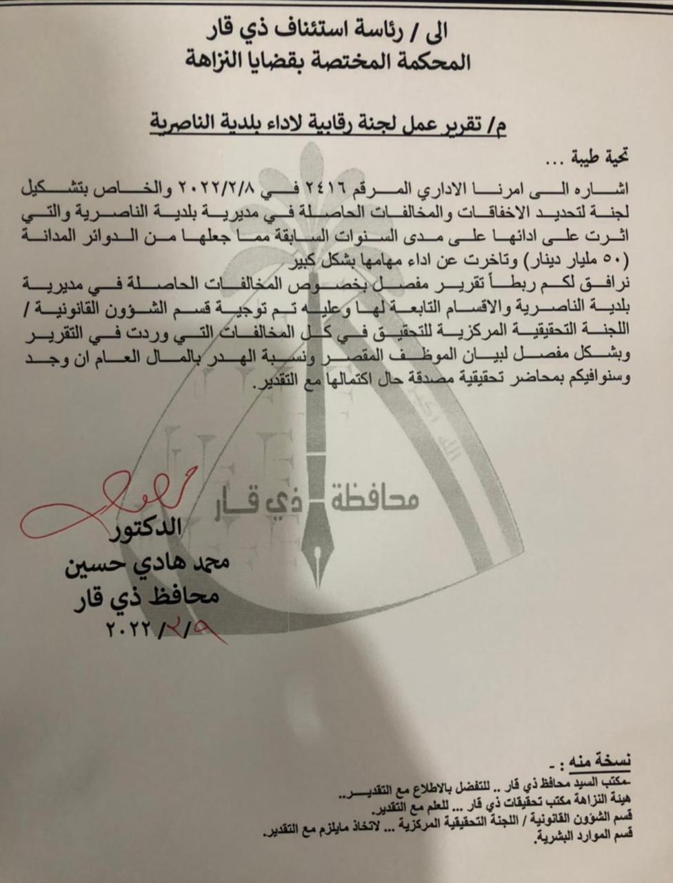 أخبار الناصرية بالوثيقة..احالة مخالفات بلدية الناصرية الى النزاهة في 10/03/2022 جريدة الناصرية الالكترونية: محافظ ذي قار يحيل مخالفات بلدية الناصرية الى محكمة النزاهة لتحديد المقصرين ومحاسبتهم. شارك هذا الموضوع: النقر للمشاركة على X (فتح في نافذة جديدة) X انقر للمشاركة على فيسبوك (فتح في نافذة جديدة) فيس بوك مرتبط أكمل القراءة