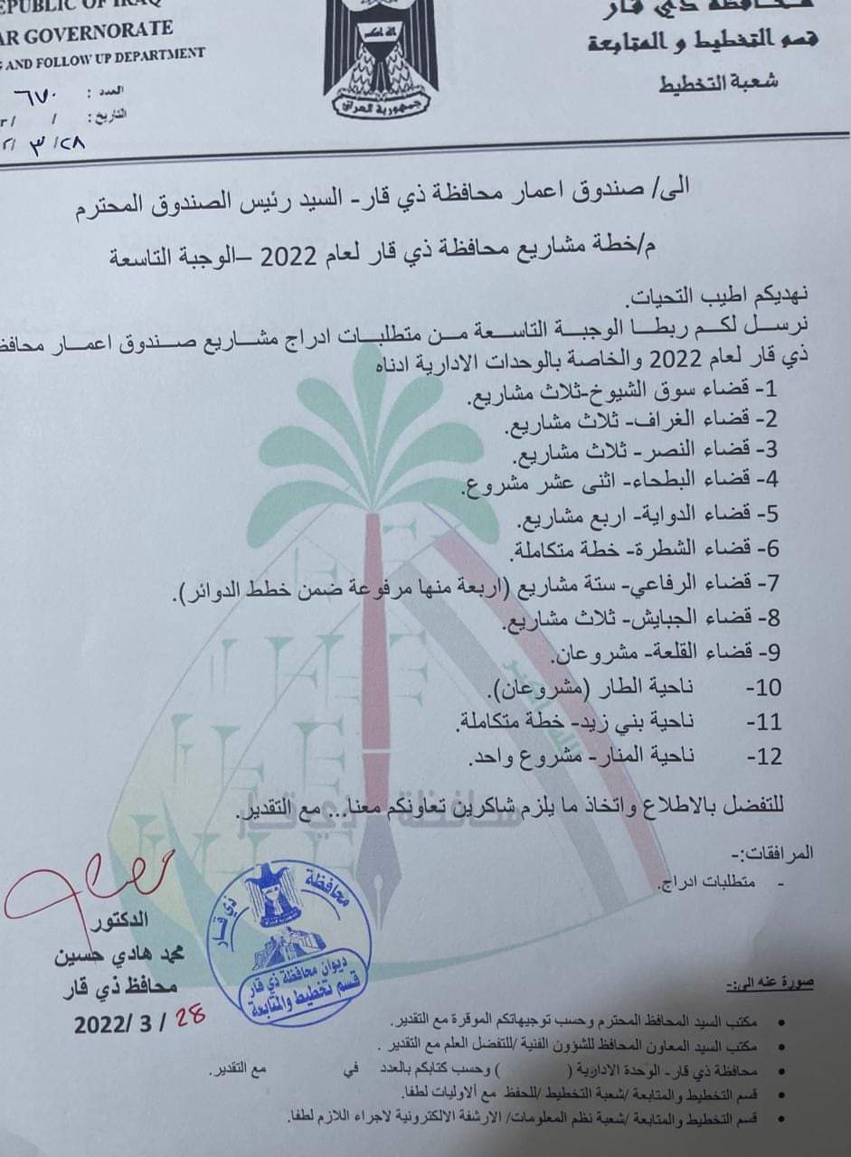اعلن محافظ ذي قار محمد هادي الغزي عن اكمال الوجبة الاخيرة من مشاريع المحافظة لعام 2022 ،وارسالها الى صندوق اعمار ذي قار ، لغرض ادراجها .