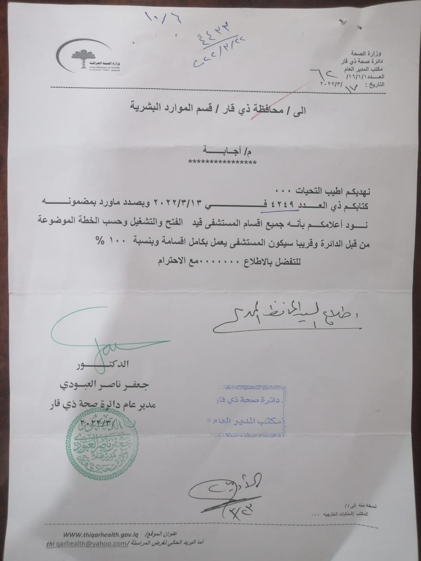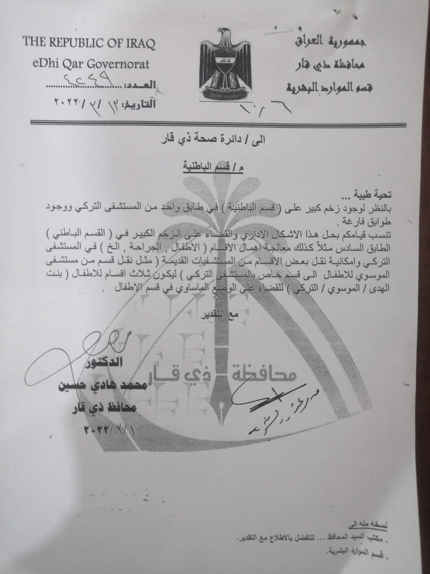 افتتحت دائرة صحة ذي قار قسما للاطفال ووسعت قسم الباطنية باضافة ردهات جديده له في الطابق السادس في مستشفى الناصرية العام ( المستشفى التركي ) .