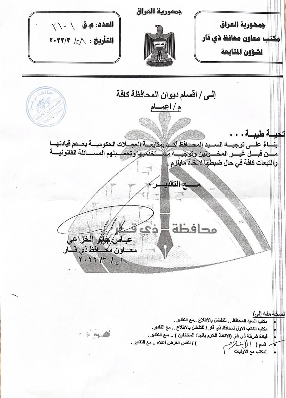 اخبار العراق بالوثيقة…ذي قار تصدر توجيهاً بشأن العجلات الحكومية في 31/03/2022 جريدة الناصرية الالكترونية: بالوثيقة ذي قار تصدر توجيهاً بشأن العجلات الحكومية. شارك هذا الموضوع: النقر للمشاركة على X (فتح في نافذة جديدة) X انقر للمشاركة على فيسبوك (فتح في نافذة جديدة) فيس بوك مرتبط أكمل القراءة