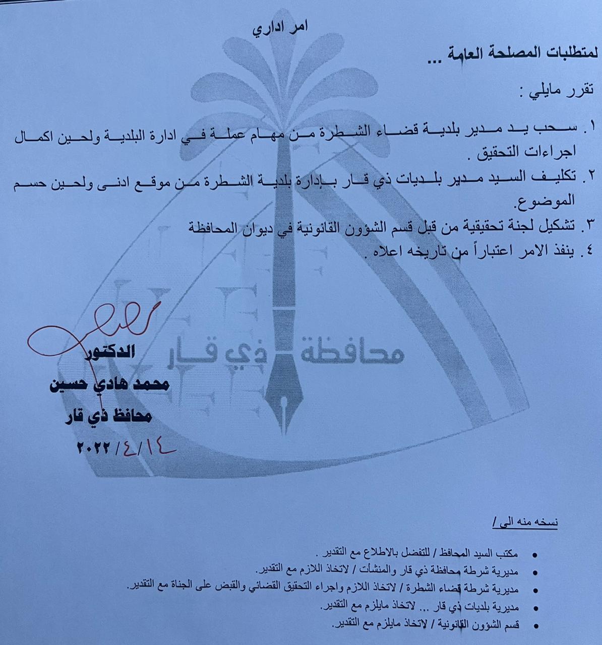 اعلن حافظ ذي قار محمد هادي الغزي اليوم الخميس عن سحب يد مدير بلدية قضاء الشطرة بعد حادثة اعتداء عدد من موظفي البلدية على احد المواطنين.