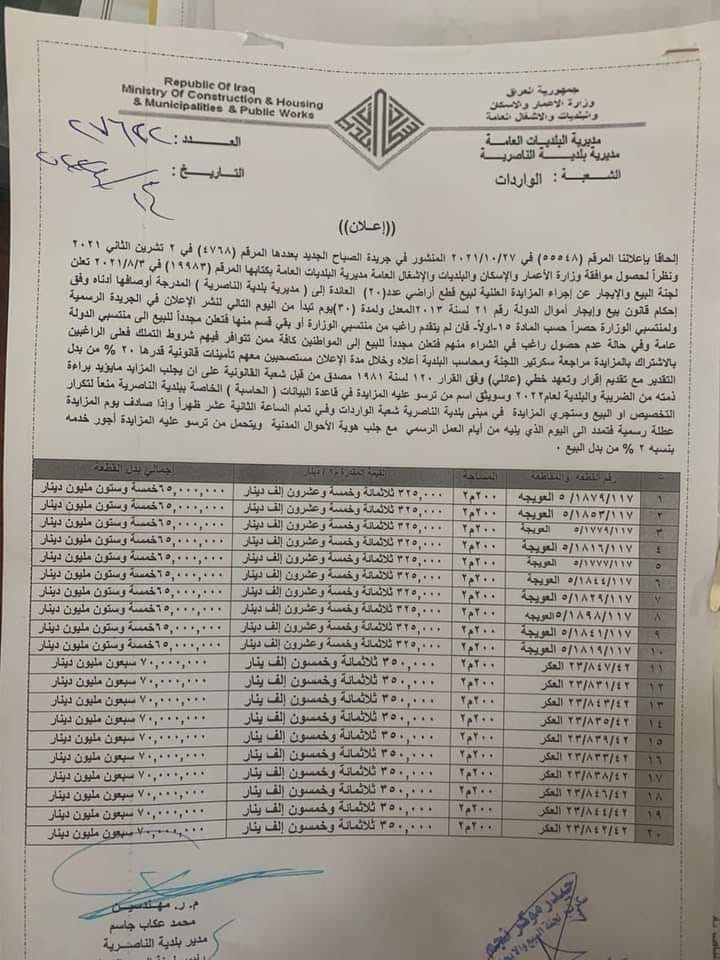 أخبار الناصرية بالوثيقة.. بلدية الناصرية تعلن عن أول وجبة قطع اراضي في مزايدة علنية في 17/04/2022 جريدة الناصرية الالكترونية : بالوثيقة بلدية الناصرية تعلن عن أول وجبة قطع اراضي في مزايدة علنية. شارك هذا الموضوع: النقر للمشاركة على X (فتح في نافذة جديدة) X انقر للمشاركة على فيسبوك (فتح في نافذة جديدة) فيس بوك مرتبط أكمل القراءة