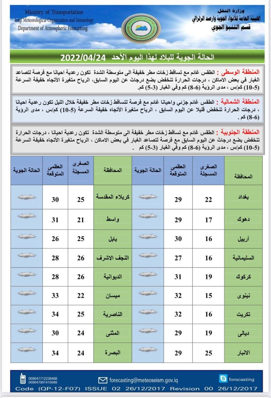 أعلنت هيئة الأنواء الجوية والرصد الزلزالي، اليوم الأحد، توقعاتها لحالة الطقس الجوية في مختلف مناطق للبلاد، لليوم والأيام الأربعة المقبلة، فيما أشارت إلى أن بعض مناطق البلاد ستشهد تساقط الأمطار لغاية يوم الخميس المقبل.