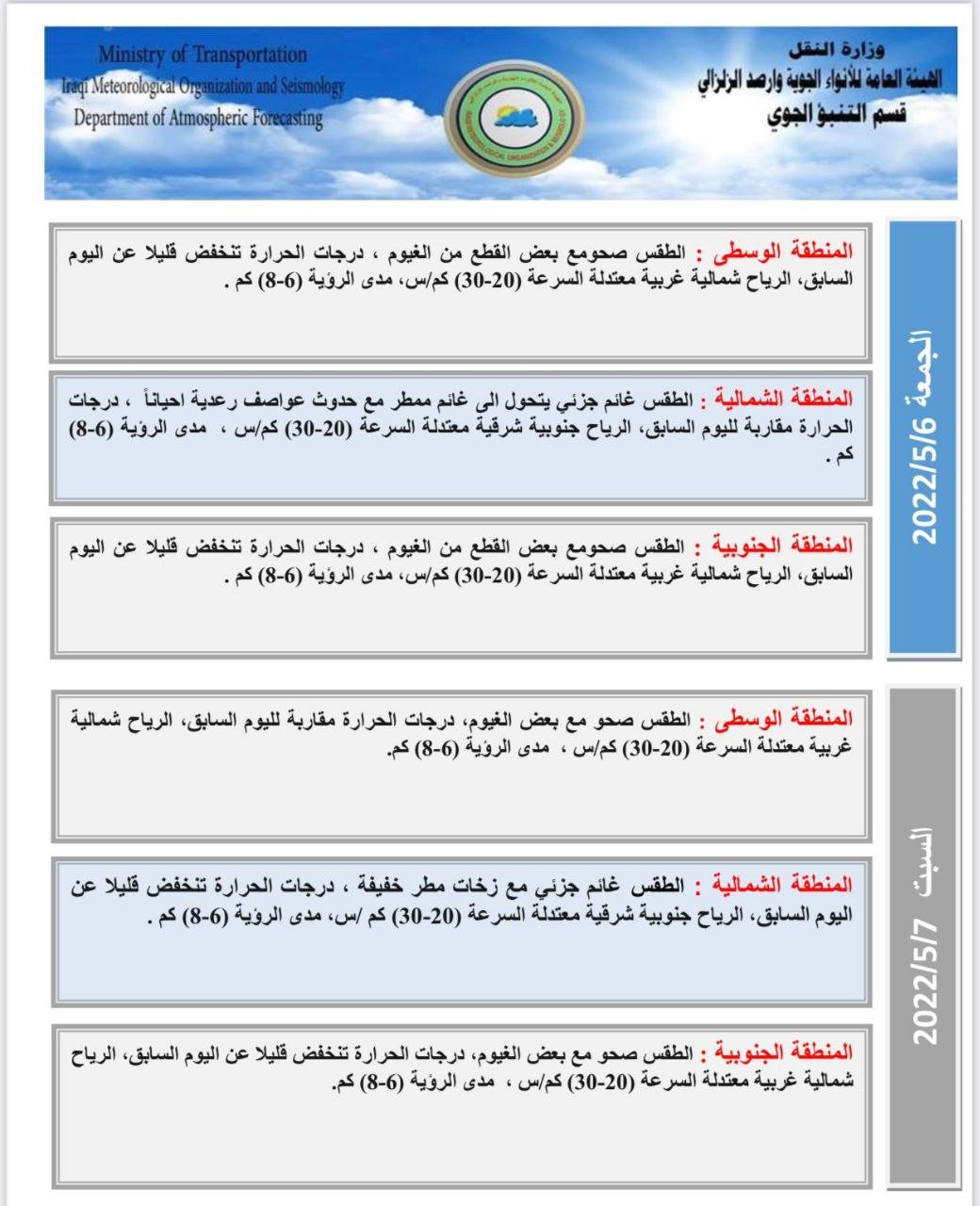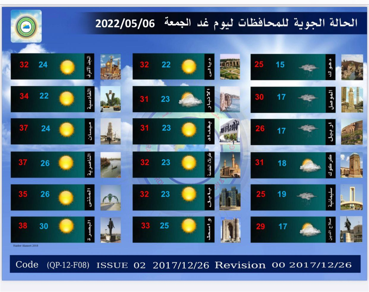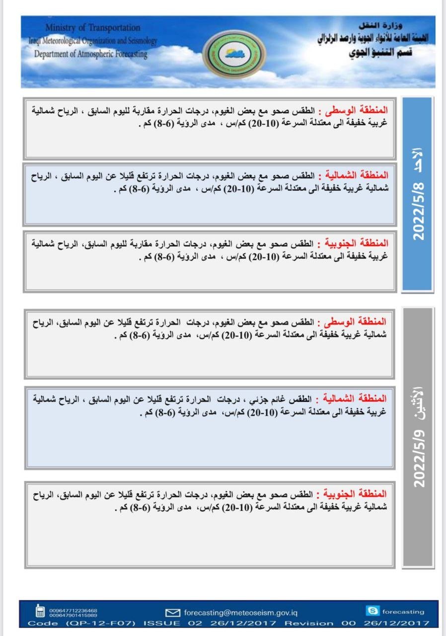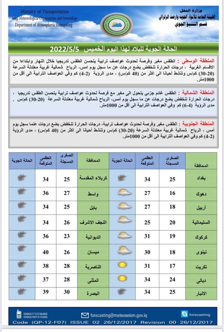 اخبار العراق طقس العراق: توقعات باستمرار العواصف الترابية خلال الايام المقبلة في 05/05/2022 جريدة الناصرية الالكترونية : توقعت هيئة الانواء الجوية، اليوم الخميس، استمرار العواصف الترابية، فيما بينت أن هناك فرصة لتساقط الأمطار خلال الشهر الحالي. شارك هذا الموضوع: النقر للمشاركة على X (فتح في نافذة جديدة) X انقر للمشاركة على فيسبوك (فتح في نافذة جديدة) فيس بوك مرتبط أكمل القراءة