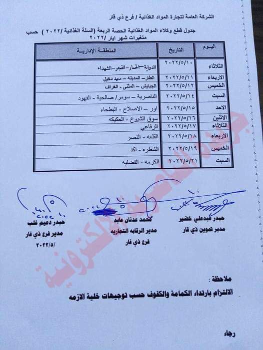 ودعت الدائرة جميع الوكلاء مراجعة الشركة العامة لتجارة المواد الغذائية في ذي قار لغرض القطع وعدم التأخير والالتزام بالموعد المحدد.