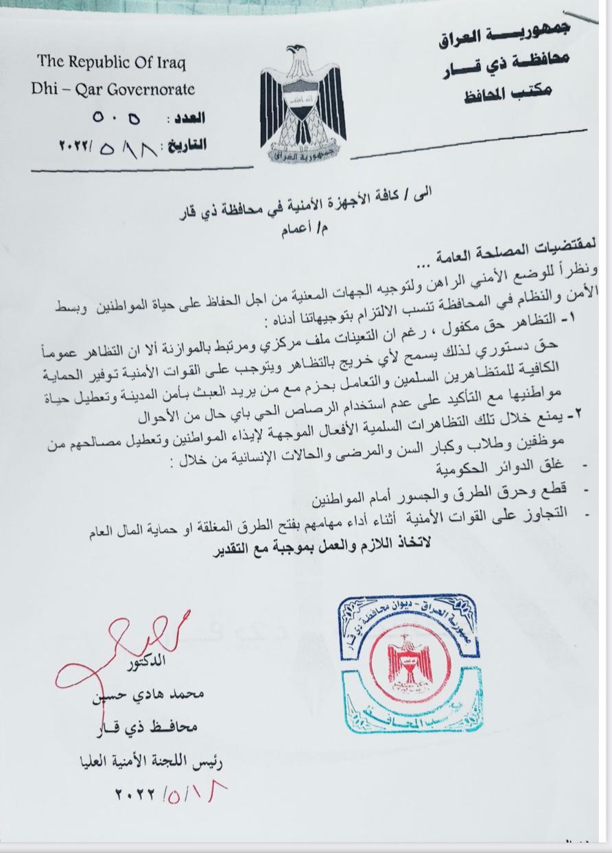 بالوثيقة… محافظ ذي قار يعلن تضامنه مع مطالب المتظاهرين ويشدد على توفير الحماية اللازمة لهم
