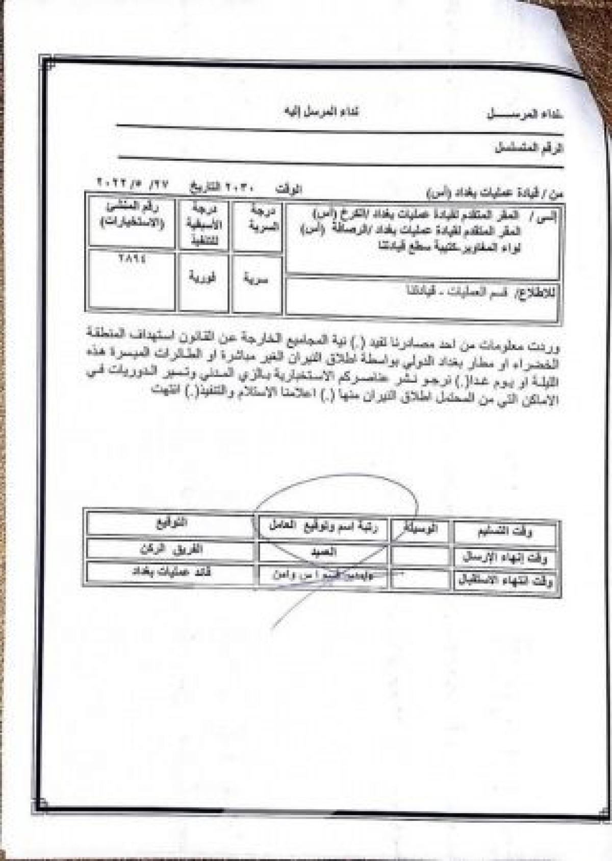 وقال المصدر بحسب وثيقة اطلعت عليها جريدة الناصرية الالكترونية، عنونت باسم قيادة عمليات بغداد، وبدرجة (سرية)، جاء فيها: “وردت معلومات من أحد مصادرنا تفيد، نية المجاميع الخارجة عن القانون، استهداف المنطقة الخضراء أو مطار بغداد الدولي، بواسطة إطلاق النيران غير المباشرة أو الطائرات المسيرة، هذه الليلة أو يوم غد”.