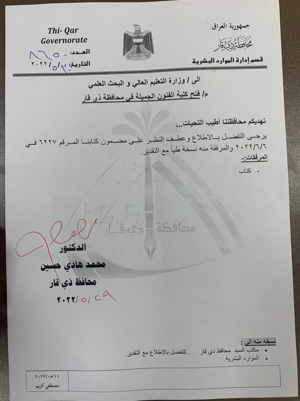 خاطب محافظ ذي قار الدكتور المهندس محمد هادي الغزي ، وزارة التعليم العالي والبحث العلمي، لغرض افتتاح كلية الفنون الجميلة في محافظة ذي قار .