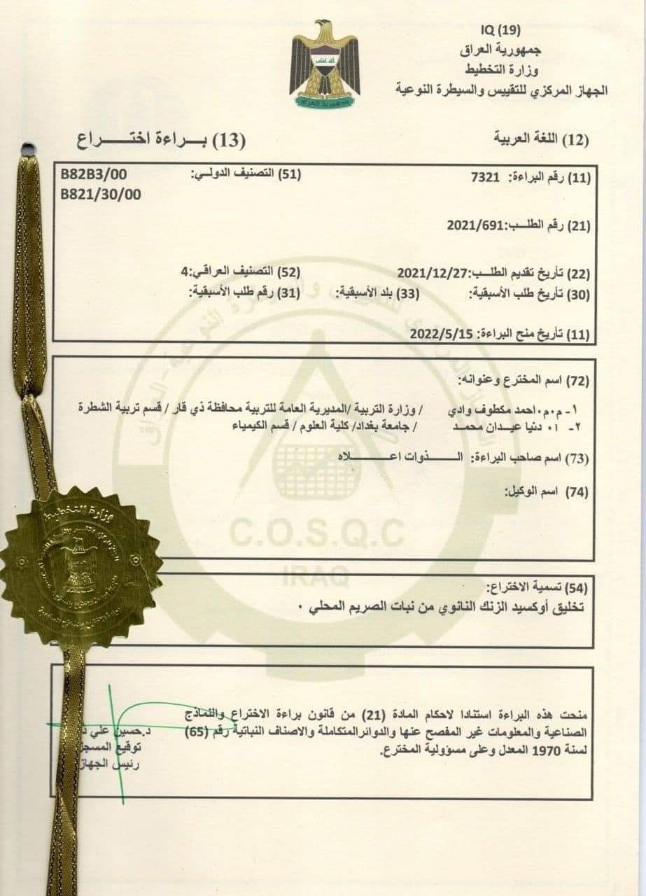 وهدفت البراءة التي حملت عنوان “تخليق أوكسيد الزنك النانوي من نبات الصريم المحلي” الى استخدام مواد نباتية عراقية لتخليق مواد نانوية بطريقة بايوكيميائية صديقة للبيئة لتقليل تلوث المياه من الملوثات العضوية الملونة عن طريق تقانة الإمتزاز والذي يعد موضوعا مهما جدا، اذ ان تلوث البيئة يعد الشغل الشاغل لدى الباحثين جميعهم في المراكز البحثية والجامعات العالمية في الدول المتقدمة، بسبب ازمات المياه المتصاعدة الناتج عن التلوث، مما يدفع الباحثين ودول العالم كافة الى البحث عن تقانات صديقة للبيئة للتخلص منه .