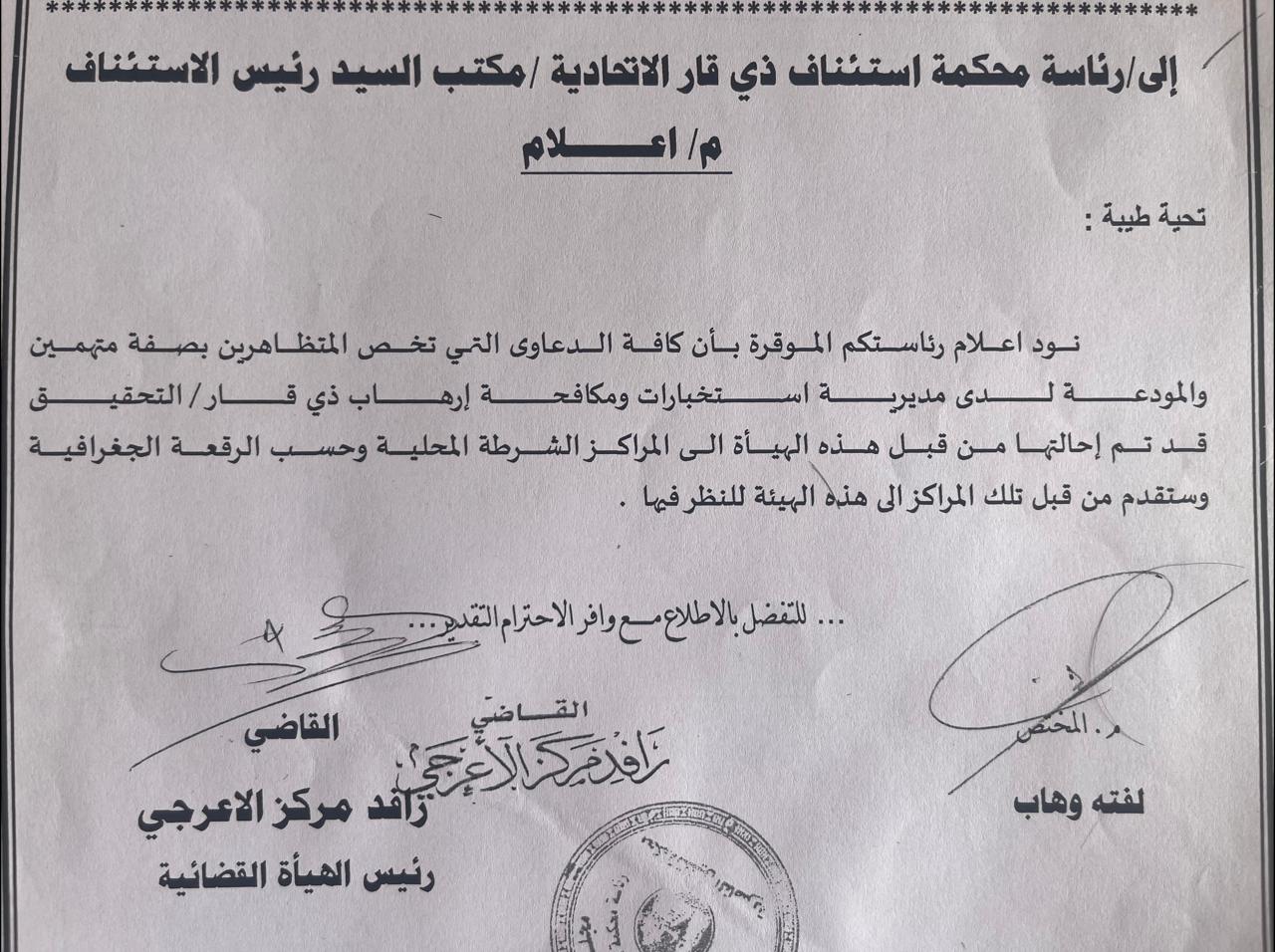اشرف محافظ ذي قار محمد هادي الغزي بعد استحصاله على الموافقات من رئاسة الوزراء و مجلس القضاء الاعلى ، على نقل ملفات الدعاوى القضائية ضد المتظاهرين من قسم الارهاب الى اقسام الشرطة المحلية ، منهيا بذلك واحدا من اعقد ملفات التوتر في المحافظة .