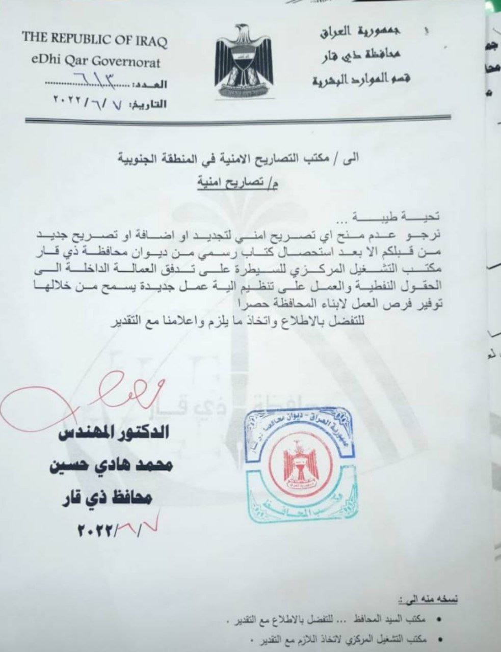 وجه محافظ ذي قار اليوم الاربعاء الى مكتب التصاريح الامنية في المنطقة الجنوبية بعدم منح اي تصريح امني ما لم يتم الحصول على موافقة مكتب التشغيل المركزي في المحافظة لمنع تدفق العمالة للحقول النفطية وايجاد فرص عمل للعاطلين.