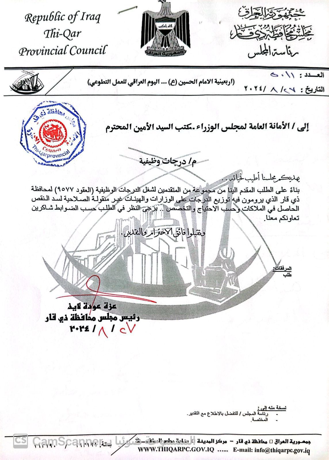 فاتح رئيس مجلس محافظة ذي قار عزة عودة الناشي الامانة العامة لمجلس الوزراء حول طلب المتقدمين لشغل الدرجات الوظيفية (العقود 9577) لمحافظة ذي قار لتوزيع الدرجات على الوزارات والهيئات غير منقولة الصلاحية لسد النقص الحاصل في الملاكات وحسب الاحتياج والتخصص.