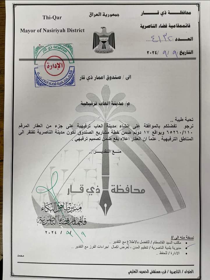 أخبار الناصرية بالوثيقة… الموافقة على انشاء مدينة العاب جديدة في الناصرية في 10/09/2024 جريدة الناصرية الالكترونية: اعلن قائممقام الناصرية عن موافقة امين عام مجلس الوزراء على انشاء مدينة العاب في الطريق الحولي في الناصرية حيث سيتم ادراجها ضمن مشاريع صندوق الاعمار. شارك هذا الموضوع: النقر للمشاركة على X (فتح في نافذة جديدة) X انقر للمشاركة على فيسبوك (فتح في نافذة جديدة) فيس بوك مرتبط أكمل القراءة