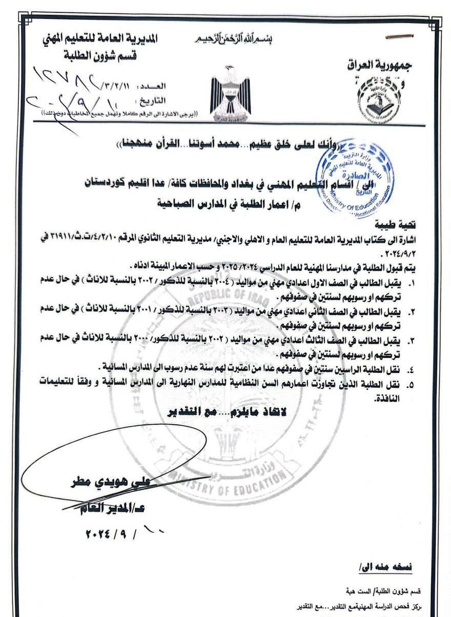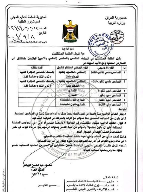 وذكرت الوزارة في بيان تلقته جريدة الناصرية الالكترونية، ان :”الامر جاء وفق ضوابط وتعليمات حددتها المديرية العامة للتعليم المهني والتي نصت على قبول الطالب الراسب (سنة) واحدة في نفس الصف الدوام سنة ثانية في المدارس المهنية الصباحية على ان يكون من المواليد المسموح بها للدوام مع اقرانه بالمرحلة الدراسية الصباحية، فيما يقبل الطالب الراسب سنتين متتاليتين في الدراسة الأكاديمية الدوام بالدراسة المسائية المهنية ولا يسمح للأناث لعدم وجود مدارس مسائية مخصصة لهن”.
