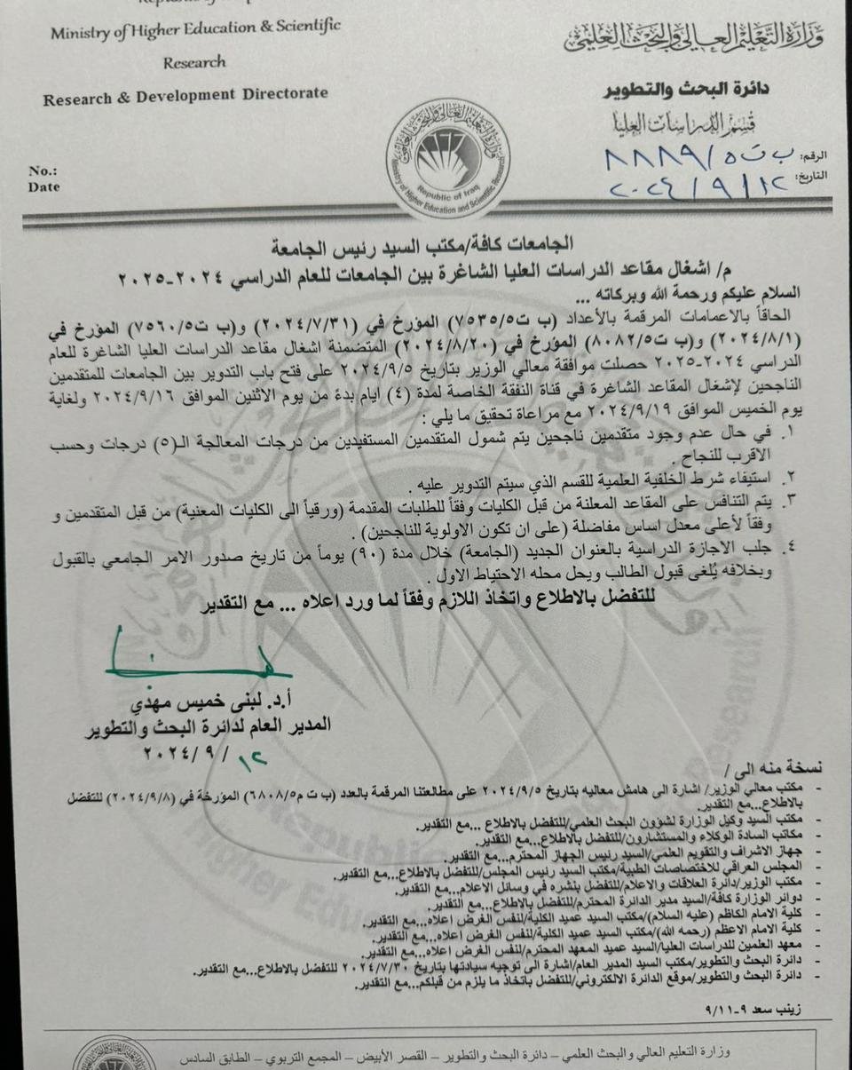 هذا وناشد عدد من الطلبة الاحتياط الناجحين المتقدمين للدراسات العليا عبر المربد بالتوسعة في مقاعد الدراسات وإشغال المقاعد الشاغرة.