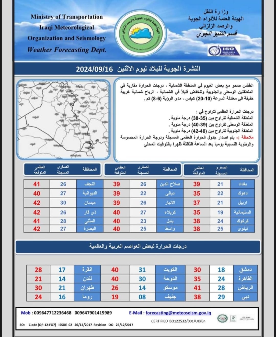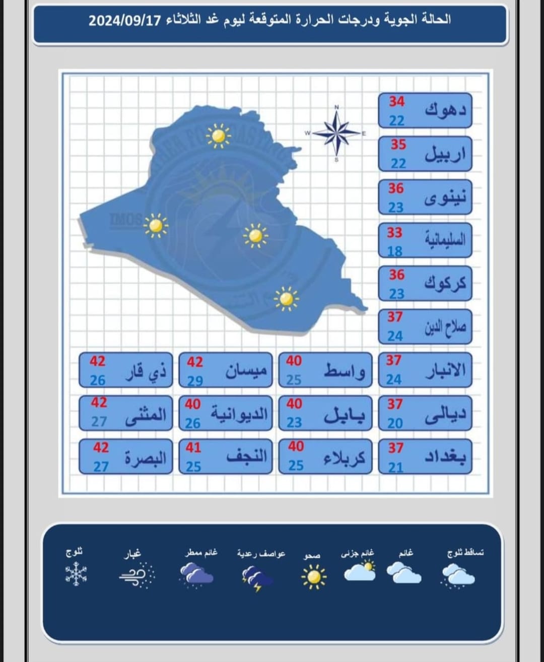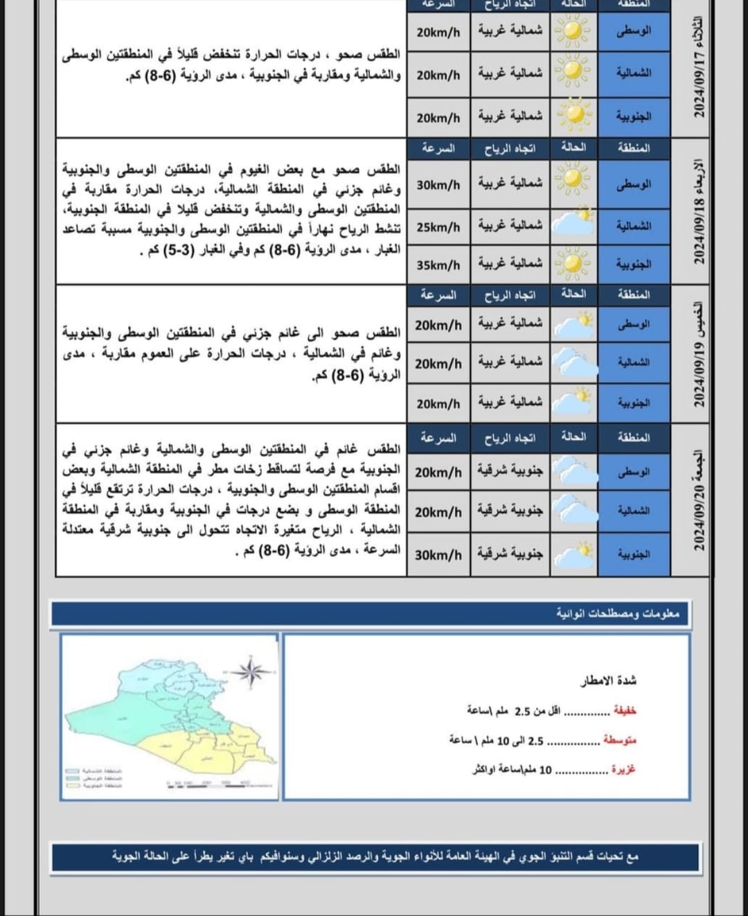 نشرت هيئة الأنواء الجوية، تقريراً مفصلاً بتوقعات الطقس لليوم الاثنين والأيام المقبلة في عموم البلاد.