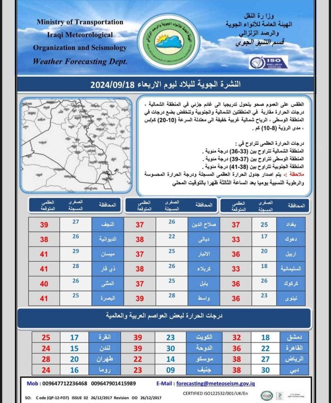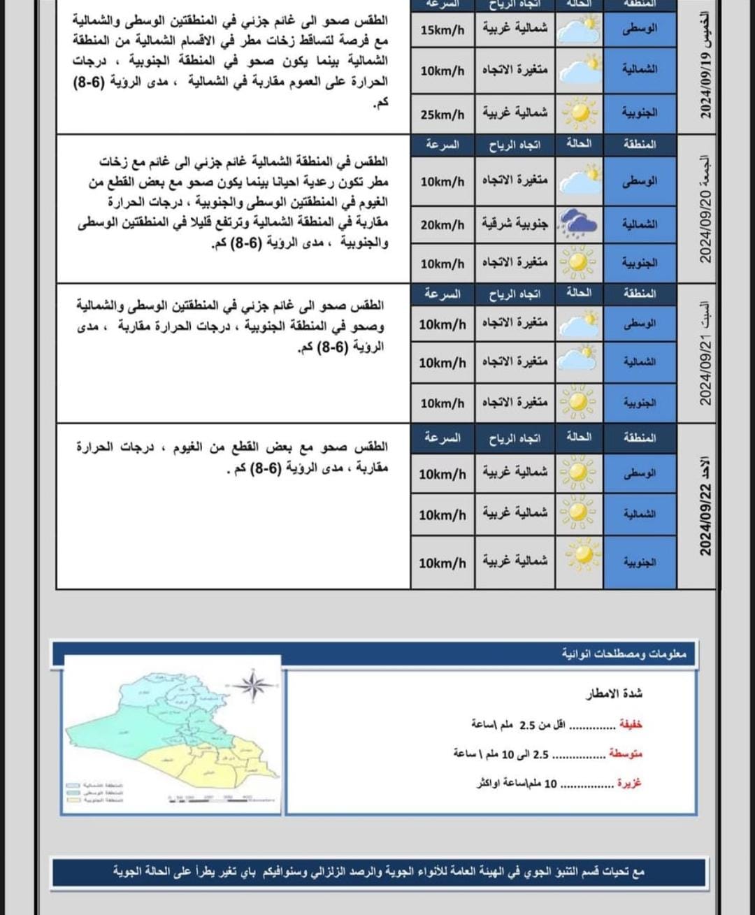 نشرت هيئة الأنواء الجوية، تقريراً مفصلاً بتوقعات الطقس لليوم الأربعاء والأيام المقبلة في عموم البلاد.