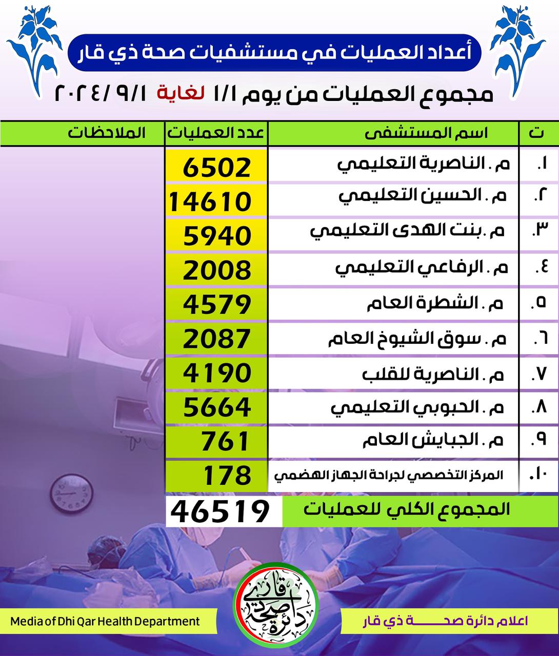 اجريت في مستشفيات دائرة صحة ذي قار (46519) عملية جراحية خلال الأشهر الثمان الأولى من العام الجاري (2024), وبين مدير عام دائرة صحة ذي قار الدكتور راشد نجم الخالدي ان هذه العمليات أجريت في مستشفيات مركز واقضية المحافظة حيث أجريت (14610) عملية جراحية في مستشفى الحسين التعليمي و (5940) عملية في مستشفى بنت الهدى التعليمي للنسائية والأطفال في حين بلغت العمليات الجراحية في مستشفى الناصرية التعليمي (6502) عملية خلال تلك الفترة, وأضاف ان مستشفى الحبوبي التعليمي اجرى (5664) عملية جراحية وان مستشفى الناصرية للقلب بلغت العمليات الجراحية فيه (4190) عملية فيما بلغ عدد العمليات في المركز التخصصي لجراحة الجهاز الهضمي (178) , اما في مستشفيات الاقضية فبين الخالدي ان مستشفى الشطرة العام اجرى (4579) عملية جراحية و (2087) عملية جراحية في مستشفى سوق الشيوخ العام في حين بلغت العمليات الجراحية في مستشفى الرفاعي التعليمي (2008) عملية جراحية واخيراً اجراء (761) عملية في مستشفى الجبايش العام .