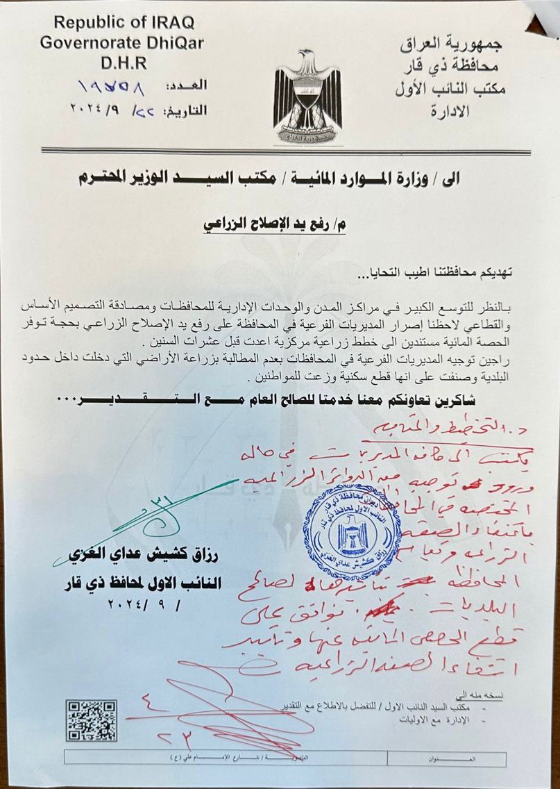 اعلن نائب محافظ ذي قار رزاق كشيش الغزي عن موافقة وزارة الموارد المائية على قطع الحصص المائية للمناطق التي تم توزيعها على المواطنين في ذي قار