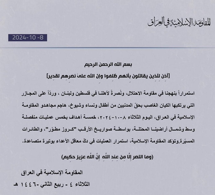 المقاومة الإسلامية في العراق: قصفنا (5) أهداف بصواريخ كروز في الأراضي المحتلة