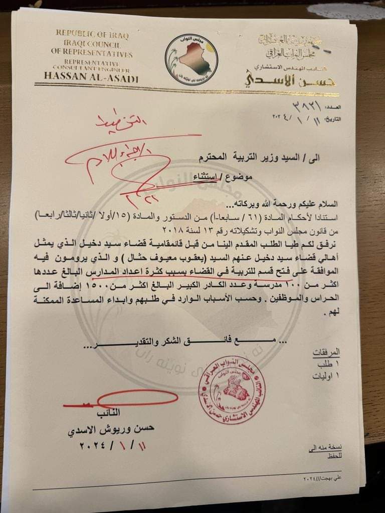 اكد النائب حسن الاسدي اليوم الخميس على وافقة وزير التربية لافتتاح قسم تربية سيد دخيل.