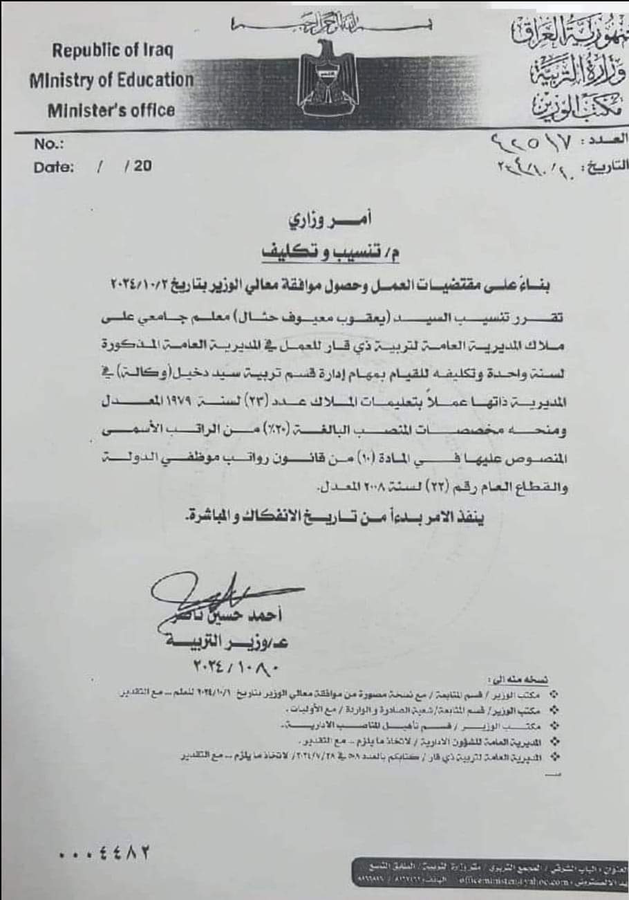 كما كلفو وزير التربية يعقوب معيوف حثال على القيام بمهام إدارة قسم تربية سيد دخيل .
