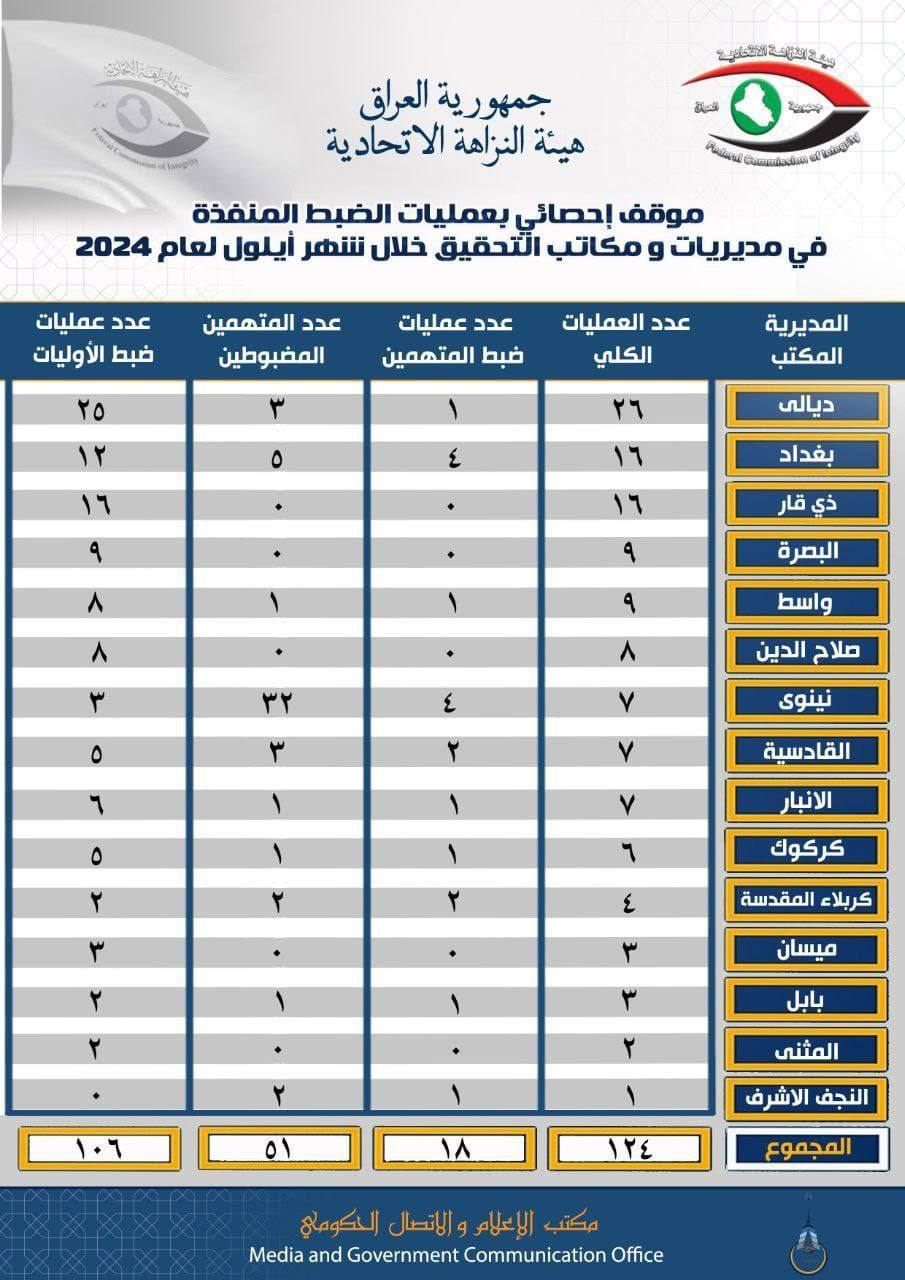 أعلنت هيئة النزاهة، اليوم الثلاثاء، ضبط (51) متهماً بــ (124) عملية نُفذت في شهر أيلول الماضي.