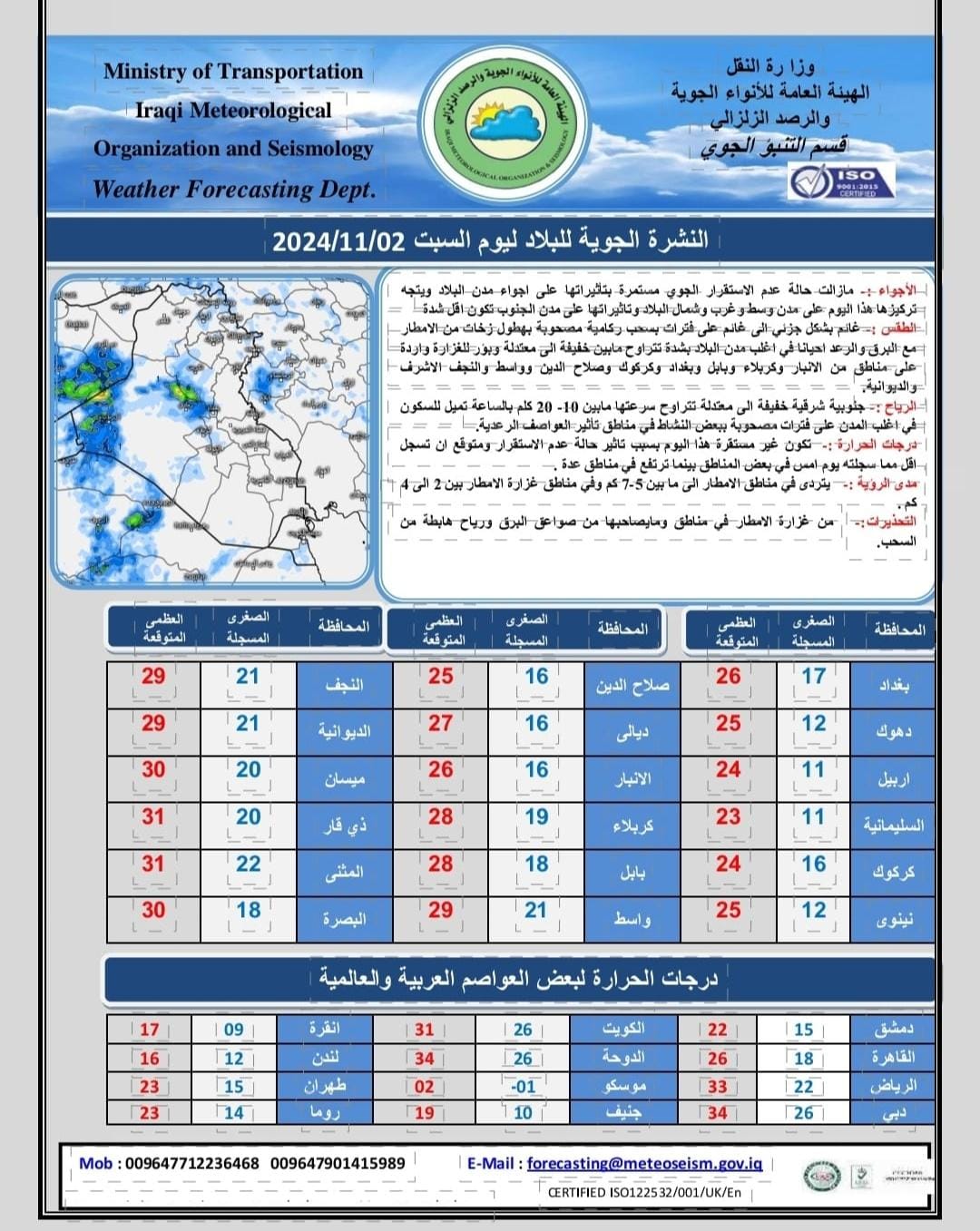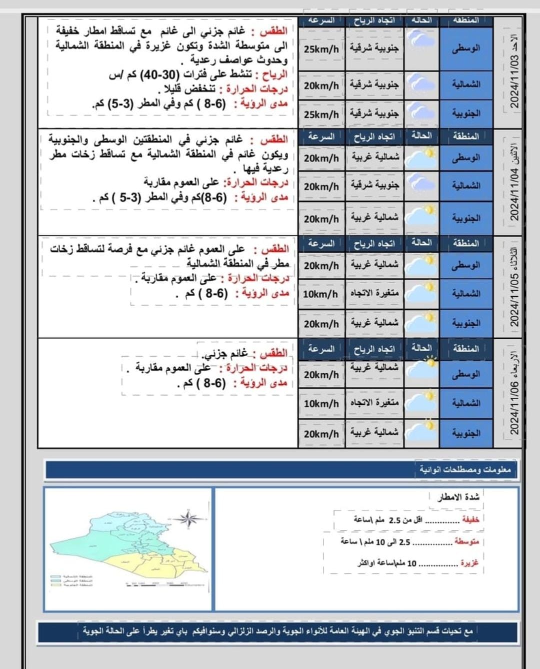 وجاء في تقرير الهيئة، أن الطقس غائم إلى غائم جزئي بسحب ركامية مع زخات مطر مصحوبة بالبرق والرعد في معظم مدن البلاد، وتوقعت الهيئة انخفاض درجات الحرارة اليوم، كما حذرت من غزارة الأمطار وما يصاحبها من صواعق البرق ورياح هابطة من السحب.