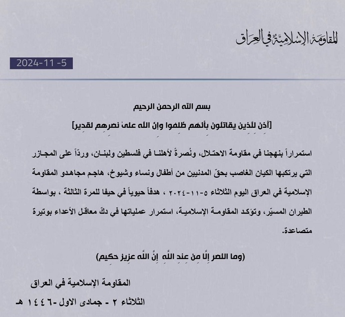 عام المقاومة الإسلامية في العراق: هاجمنا هدفاً في حيفا للمرة الثالثة في 05/11/2024 جريدة الناصرية الالكترونية: اعلنت المقاومة الإسلامية في العراق عن مهاجمة أحد الاهدف في حيفا للمرة الثالثة بواسطة الطيران المسير. شارك هذا الموضوع: النقر للمشاركة على X (فتح في نافذة جديدة) X انقر للمشاركة على فيسبوك (فتح في نافذة جديدة) فيس بوك مرتبط أكمل القراءة